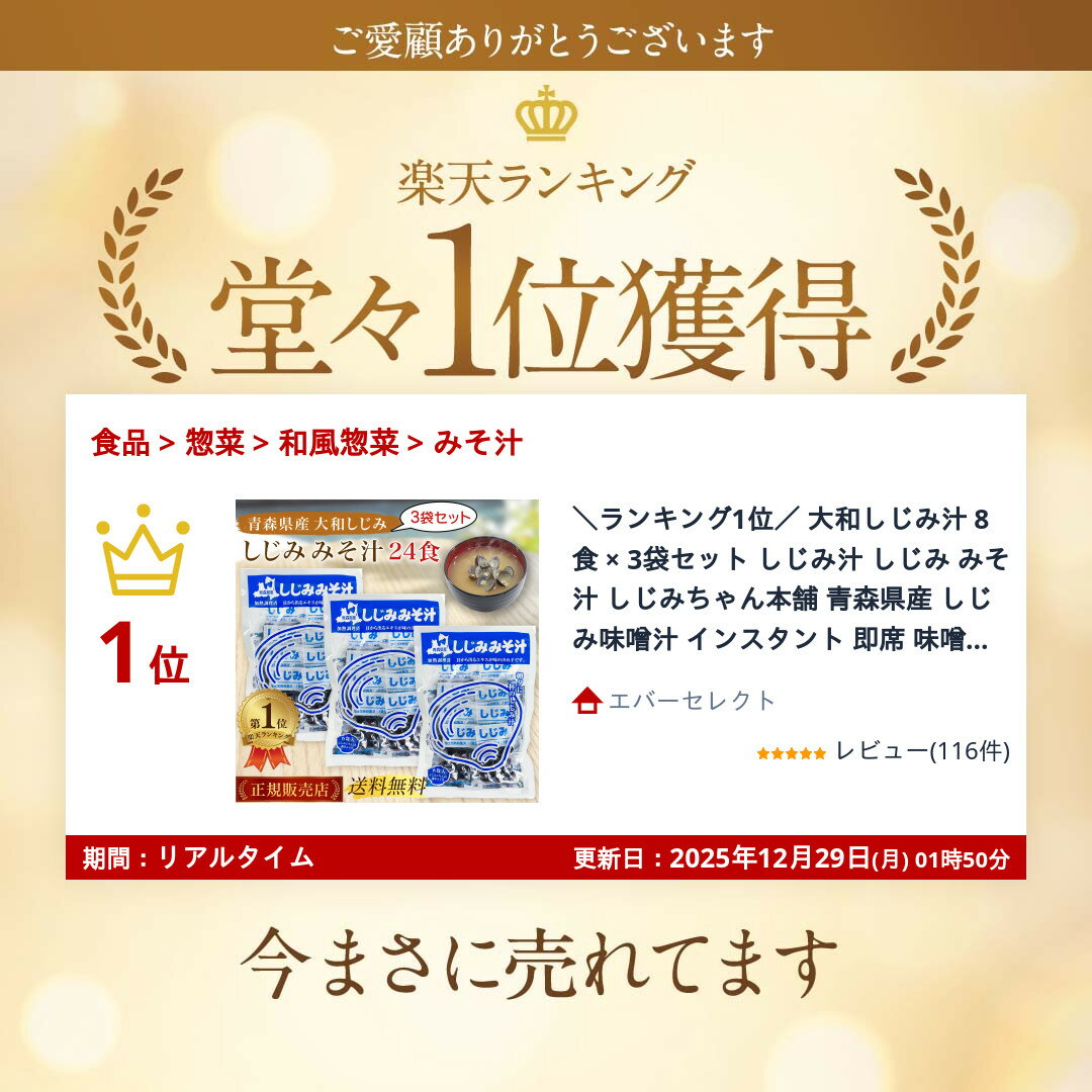商品情報商品名大和しじみ汁 3袋セット内容量具(殻付きしじみ):672g(28g×24袋) 調味みそ:504g(21g×24袋)原材料の産地青森県アレルギー物質大豆/食品衛生法に基づく28品目中保存方法常温商品説明青森県が誇る美食のひとつ「大和しじみ」を殻付きのまま真空パックし、しじみエキス入りの調味みそと組み合せた、即席しじみ汁のお徳な24食セットです。お椀やマグカップにしじみと調味みそを入れ、お湯を注ぐだけで美味しい青森県産しじみ汁がお召しあがりいただけます。忙しいけれどみそ汁が欲しいときに、お弁当のお供に、お酒を飲んだ翌日に。常温保存が可能ですので、ご家庭に常備していただければ多くの場面で重宝します。また、単身赴任中の方や、学業で親元を離れて暮らしているお子様・お孫様への飾らない贈り物として、海外旅行のお供にもぴったりの商品です。\ランキング1位/ 大和しじみ汁 8食 × 3袋セット しじみ汁 しじみ みそ汁 しじみちゃん本舗 青森県産 しじみ味噌汁 インスタント 即席 味噌汁 送料無料 しじみ汁 しじみちゃん本舗 お湯を注ぐだけですぐに食べられる 本格風味のしじみ味噌汁 24食分 大和しじみ汁 青森県産 しじみ みそ汁 インスタント 即席 味噌汁 青森県が誇る美食のひとつ「大和しじみ」を殻付きのまま真空パックし、しじみエキス入りの調味みそと組み合せた、即席しじみ汁のお徳な24食セットです。お椀やマグカップにしじみと調味みそを入れ、お湯を注ぐだけで美味しい青森県産しじみ汁がお召しあがりいただけます。忙しいけれどみそ汁が欲しいときに、お弁当のお供に、お酒を飲んだ翌日に。常温保存が可能ですので、ご家庭に常備していただければ多くの場面で重宝します。また、単身赴任中の方や、学業で親元を離れて暮らしているお子様・お孫様への飾らない贈り物として、海外旅行のお供にもぴったりの商品です。【内容量】具(殻付きしじみ):672g(28g×24袋) 調味みそ:504g(21g×24袋) 【アレルゲン】大豆(28品目中) 10