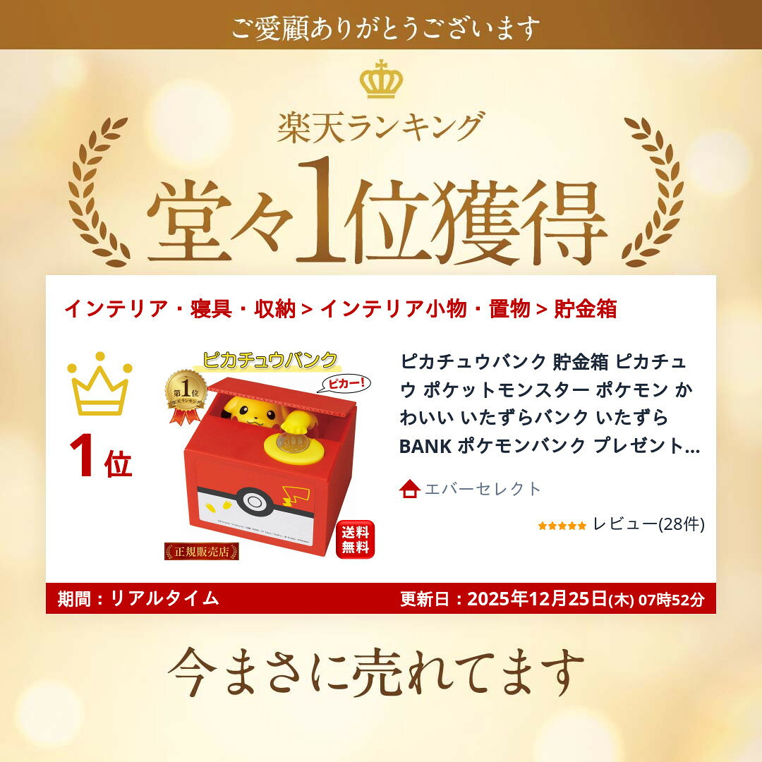 ピカチュウバンク 貯金箱 ピカチュウ ポケットモンスター ポケモン かわいい いたずらバンク いたずらBANK ポケモンバンク プレゼント 小学生 キャラクター シャイン 送料無料 ピカチュウ ポケットモンスター 500円玉 かわいい 自動 貯金箱 ピカチュウバンク ポケモン かわいい いたずらバンク いたずらBANK プレゼント 小学生 ・ピカチュウがたくさんおしゃべりしてくれるから、楽しみながら貯金ができる。・何度でも貯金したくなる、とっても可愛い癒し系貯金箱♪・TVアニメ「ポケットモンスター」でおなじみのピカチュウがコインを大事にお預かり。・アニメと同じピカチュウの声で15音声243通りのおしゃべりパターンを楽しめる。・子供の誕生日プレゼントやクリスマスプレゼントに!パッケージサイズ:W126 ×H102 ×D106(mm)対象年齢:6歳以上・単3形アルカリ乾電池 2本使用(別売り)※アルカリ乾電池専用・日本の硬貨専用です。これ以外の硬貨は使用しないで下さい。(1円、5円、10円、50円、100円、500円の現行硬貨6種)硬貨は必ず1枚ずつ入れて下さい。・硬貨は、500円玉で約40枚入りますが、コイン収納部に均等に入るように、左右に振って下さい。 5