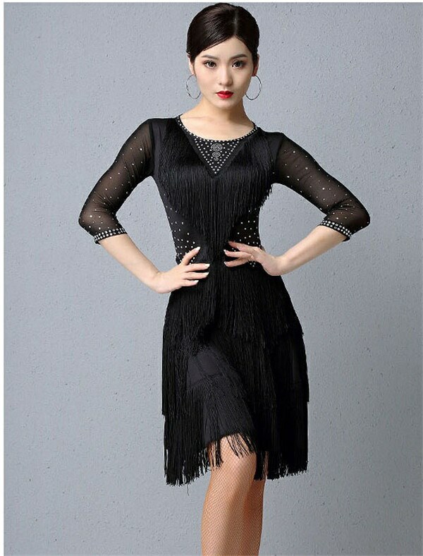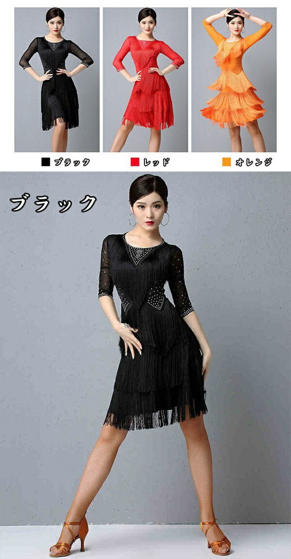 社交ドレス ラテン ドレス 七分袖 ラテン ダンス 衣装 演技服 ワンピース 練習着 ワルツ チャチャチャ ラテン ステージ 演出 着 演出 フリンジ M L XL 2XL 赤 黒 オレンジ de049l6l6y7/代引不可