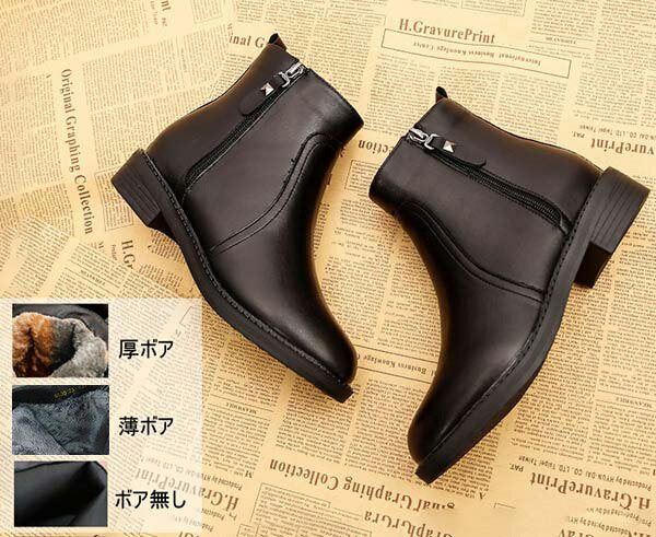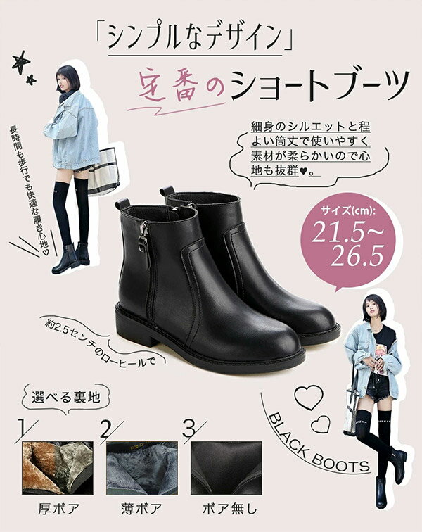 「当店人気再入荷」ローヒール ショートブーツ レディース 大きいサイズ サイドジップ ペタンコ ローヒール 歩きやすい 痛くない 脚長 防寒 秋冬 春 ボア PU ブラック 黒 通勤 21.5 22.0 22.5 23.0 23.5 24.0 24.5 25 25.5 26.0 26.5 ei123t2t2t2