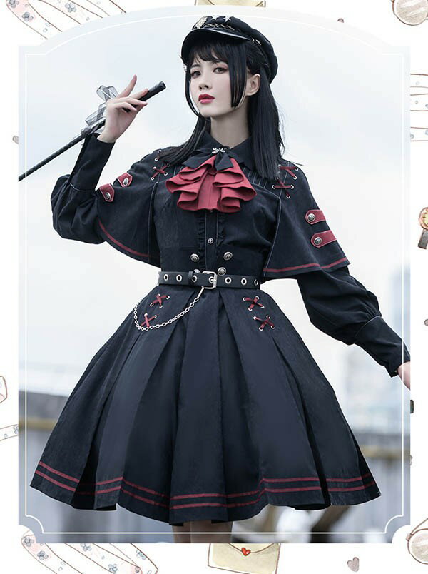 ミニロリ 軍服ロリータ フルセット ブラウス スカート 上下フルセット ミリタリーロリィタ ブラック 黒 膝丈 レディース ロリータアウター 着痩せ 女の子 長袖あり ゴスロリ 厚手 防寒 寒さ対策 柔らかい 軽い着心地 暖かい dd143x1x1t2