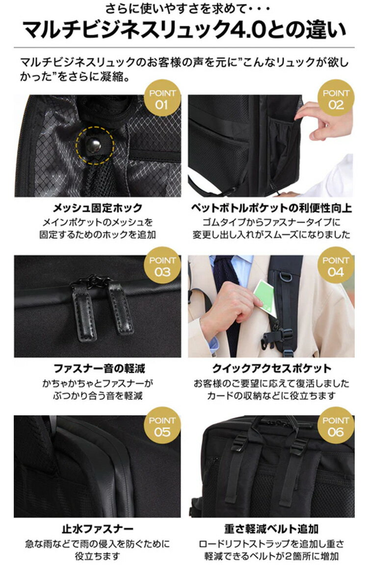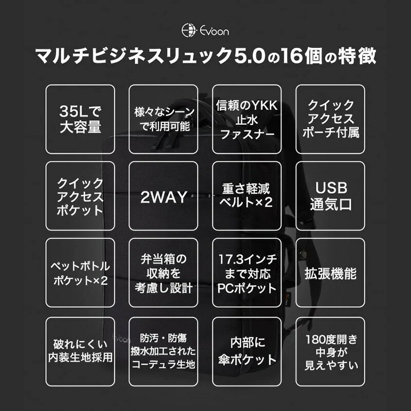 商品情報 Evoon マルチビジネスリュック5.0について 【機能説明】35Lで大容量/様々なシーンで利用可能/信頼のYKK止水ファスナー/クイックアクセスポーチ付属/クイックアクセスポケット/2WAY/重さ軽減ベルト×2/USB通気口/ペットボトルポケット×2/弁当箱の収納を考慮し設計/17.3インチまで対応PCポケット/拡張機能/破れにくい内装生地採用/防汚防傷撥水加工されたコーデュラ生地/内部に傘ポケット/180度開き中身が見えやすい等・バッグが大きすぎて、バッグの存在が目立ちすぎてしまうカンジを抑えつつ、便利な機能性、大容量にこだわりました。 TSAダイヤルロック TSAダイヤルロックを一個無料で付属しております。これで海外出張も安心!(フロントポケットの上段にTSAダイヤルロックが入っています) サイズ・重量 本体サイズ:44.5 × 32.5 × 15(cm)拡張前 拡張後:15cm→22cm 本体重量:約1.45kg 利用シーン 派手過ぎず、地味すぎずをテーマにシンプルでスタイリッシュなデザイン。ビジネス、トラベルを中心とし、その他様々な利用シーンやファッションでも馴染むように設計されています。 ※マルチビジネスリュック®は弊社、株式会社Gerberaが権利を保有している登録商標ですさらに進化し、これが欲しかったを凝縮 マルチビジネスリュック5.0 こんな方におすすめ 大容量で多収納リュックが欲しい ビジネス〜プライベートで使用したい ファスナーが壊れにくいリュックが欲しい 出張時にスーツケースは使用したくない 撥水加工や防汚、防傷素材のリュックが欲しい 生地が丈夫で長年愛用できるリュックが欲しい 両手が空いている状態で快適に通勤したい 仕事終わりにそのままジムに行きたい 製品概要 【素材】通常のナイロンと比べて7倍の強度を持ち、撥水・防傷・防汚の効果がある高品質なコーデュラナイロンの生地を採用しました。 【重量】重量は1.45kgになります。 サイズ感 カラーバリエーション マルチビジネスリュックシリーズ 比較表
