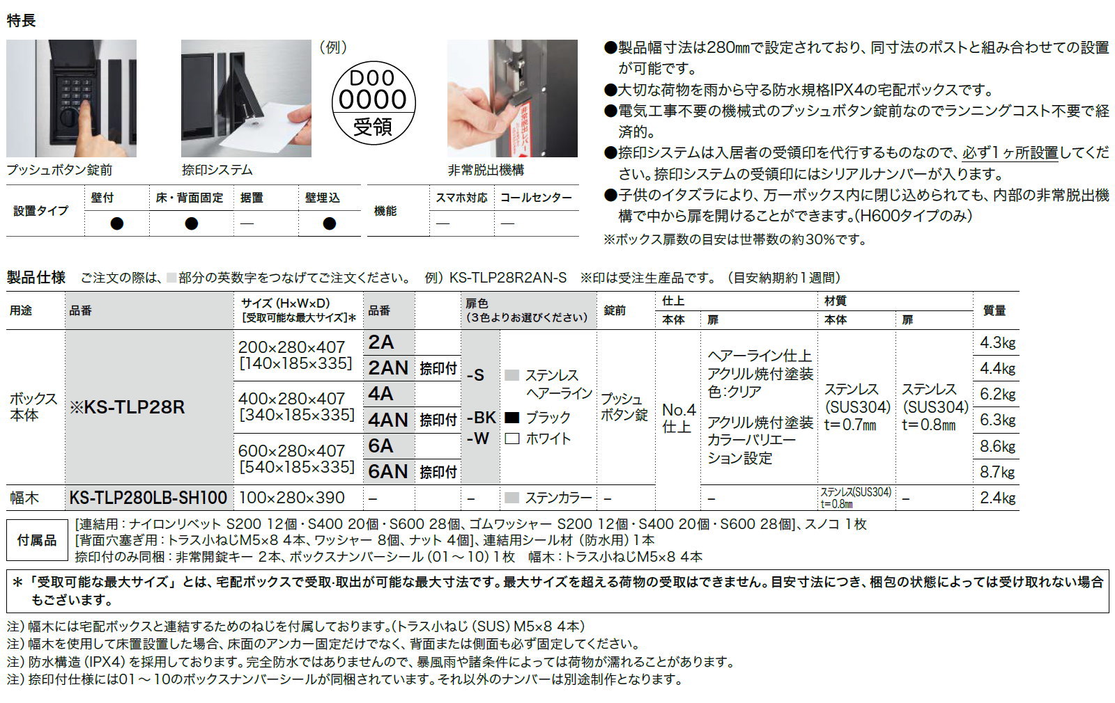 商 品 詳 細商品名KS-TLP28R4AN-BK 集合住宅 アパート マンションサイズ・重量●本体サイズ:H400×W280×D407 ●ボックス内寸法:H340×W185×D335 ●6.3kg材質・仕上げ【材質】 本体:ステンレス(SUS304)t=0.7mm 扉:ステンレス(SUS304)t=0.8mm 【仕上げ】 本体:No.4仕上 扉:ヘア—ライン仕上げ、アクリル焼付塗装(色:ブラック)特長●後付けができるためスペースに応じて設置できます。(壁付) ●電気不要のメカ式のプッシュボタン錠前なのでランニングコスト不要で経済的。 ※ボックス扉数の目安は世帯数の20%〜30%です。 ●防水規格IPX4を採用しております。完全防水ではありませんので、暴風雨や諸条件によっては荷物が濡れることがあります。 ●万が一雨が入ってもスノコ付きで荷物が濡れにくいです。(※注意事項を必ずご確認ください)備考※送料無料(北海道、沖縄、離島は別途料金が必要となります)。 ※メーカー直送のため、代引き支払いできません。注意事項※完全防水ではありませんので、暴風雨や諸条件によっては荷物が濡れることがあります。 ※施工は専門業者にご依頼ください。 ※イメージ画像は使用するブラウザ・モニターにより色が違って見える場合があります。型番KS-TLP28R-4AN-BKKSTLP28R4ANBKKS-TLP28R4AN-BK施工について※施工はお客様にて責任を持ってご手配ください。 ※施工には、専門的な知識と、工具、技術が必要となります。 ※お近くの施工業者様に設置を依頼して頂くようお願い致します。 ※お近くの施工業者様に相談の上、設置を依頼して頂くようお願い致します。関連商品検索はこちらから おしゃれ・シンプルなおすすめ集合住宅用ポストを多数準備 屋外用・屋内用 マンション・アパート等の集合住宅に各メーカーの商品をラインナップ【キョーワナスタ(NASTA)】プチ宅・プチ宅unit・D-ALL・Qual クオール・公団型集合住宅用・防滴?屋内用【ダイケン】TBX-1F・TBX-2F・ポステックコーワソニア・杉田エース・神栄ホームクリエイトなど1戸用・2戸用・3戸用・4戸用・6戸用・8戸用・10戸用・12戸用・18戸用集合住宅用郵便ポストをご購入の方は通常1枚800円の部屋番号プレートが500円に!必要数量分をポストと同時に買い物カゴに入れてご注文をお願いいたします。[お得なオリジナルプレートはこちらから ] ★集合住宅用商品 売れてる人気ランキングはこちら ●集合住宅用宅配のカテゴリ一覧 ●1戸連結タイプのカテゴリ一覧 ●2戸連結タイプのカテゴリ一覧 ●3戸連結タイプのカテゴリ一覧 ●4戸連結タイプのカテゴリ一覧 ●その他連結タイプのカテゴリ一覧 ●関連商品 NASTA ナスタ 幅木 KS-TLP280LB-SH100 ステンカラー 高さ100×幅280×奥行390 13,420円