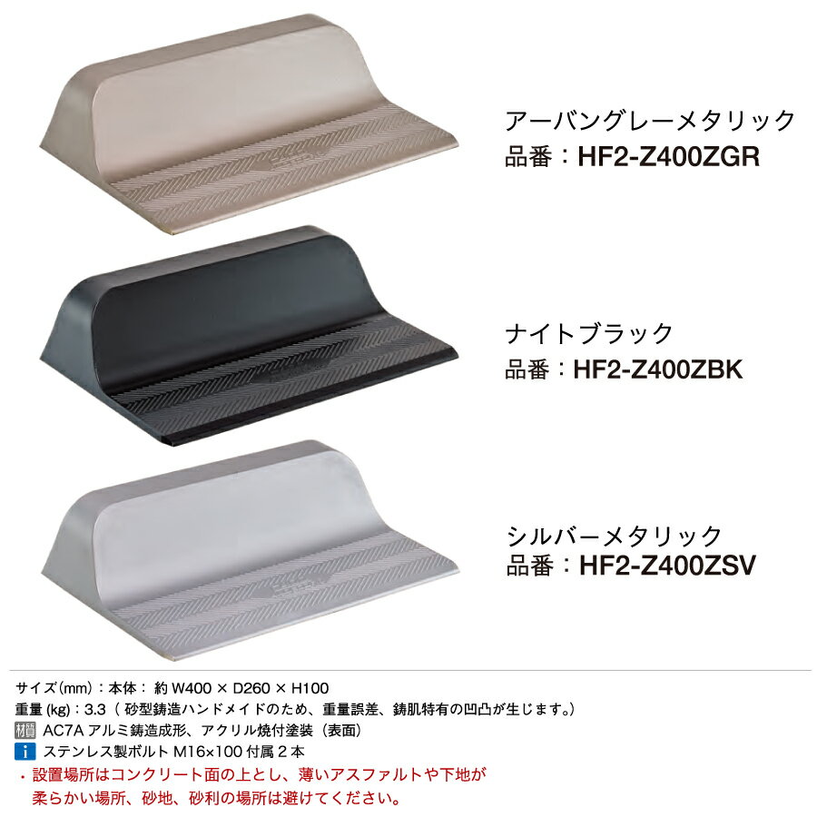 商 品 詳 細商品名アルデコールZ400 ゼッティ シルバーメタリック HF2-Z400ZSV ※1本のみサイズ(mm)本体:約W400×D260×H100重量(kg)3.3kg(1本) ※砂型鋳造ハンドメイドのため、重量誤差、鋳肌特有の凸凹が生じます。材質AC7Aアルミ鋳造成形、アクリル焼付塗装(表面)付属品ステンレス製ボルト:M16×100mm×2本付属 ※コンクリートボンドは付属しておりません。別途市販品をご用意願います。備考※沖縄・離島は別途送料が必要となります。事前にお問い合わせ下さい。 ※配送には約2週間程度必要となります。(欠品時は2〜4週間) ※砂型鋳造ハンドメイドのため重量誤差、鋳物特有の凸凹が生じます。 ※メーカー直送品の為、代引き決済不可。 ※代引きを選択頂いた場合は自動キャンセルをさせて頂きます。補足事項【お手入れと美観について】 ・ 汚れが目立つ場合は、中性洗剤を含ませたタオルで表面をこすってみてください。強くこすりすぎると 塗装がはがれたり、最初の肌合いが削れてしまいますので目立たない場所でのテストをおすすめします。 ・ 塗装のはがれが気になる場合は、市販の近似色塗料でタッチアップしてください。禁止事項※車止めの用途以外でのご使用はおやめください。 ※設置場所はコンクリート面の上とし、薄いアスファルトや下地が柔らかい場所、砂地、砂利の場所は避けてください。 ※本製品は車両用製品ですので、坂道や一般道でのご使用はおやめください。注意事項※本製品は車両用製品ですので、坂道や一般道でのご使用はおやめください。 ※本製品への車両の乗上げ、勢いよく車輪を当てるなどした場合、ぐらつきや破損の原因となりますので、 運転には十分ご注意ください。 ※タイヤはゴムが主体です。タイヤ側面は特に剛性がなく、側面から当てるとパンクしたり裂ける場合があります。本製品によるこれらの損害は弁償やクレームの対象外です。 ※本製品は金属製品のため、夏場や直射日光下では表面温度が50度を超す場合がございますので、素手や素足で触れないでください。また、ペットのお散歩の際も十分気をつけてください。 ※車止めの用途以外でのご使用はおやめください。施工について※施工はお客様にて責任を持ってご手配ください。 ※施工には、専門的な知識と、工具、技術が必要となります。 ※お近くの施工業者様に設置を依頼して頂くようお願い致します。 ※お近くの施工業者様に相談の上、設置を依頼して頂くようお願い致します。お庭に設置する屋外商品を多数取り揃えております。欲しい商品を見つけやすいよう様々な検索方法をご用意しております。 メーカー検索やカテゴリ検索で選べるエクステリア商品がいっぱい!ご不明な点がございましたらお気軽にお問い合わせください。↓↓まずは当店人気ランキングをチェック↓↓ ★当店人気ランキングはこちらから ●関連商品 オンリーワンクラブ アルデコールZ400 ゼッティ シルバーメタリック アーバングレーメタリック ナイトブラック ZETTY ※1本のみ 16,000円オンリーワンクラブ アルデコールZ400 ゼッティ プレミアム シルバーメタリック アーバングレーメタリック ナイトブラック ZETTY Premium ※1本のみ 16,000円オンリーワンクラブ アルデコール ZETTY プレミアム ロング タイプ1000 アーバングレーメタリック 約W1000×D260×H85mm ゼッティ Premium ※1本のみ 60,000円オンリーワンクラブ アルデコール ZETTY プレミアム ロング タイプ2000 アーバングレーメタリック 約W2000×D260×H85mm ゼッティ Premium ※1本のみ 140,000円