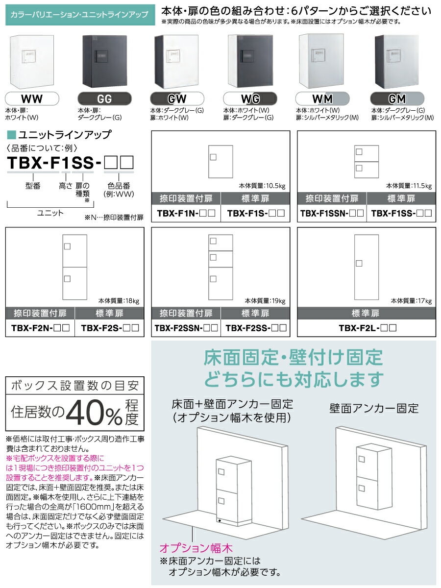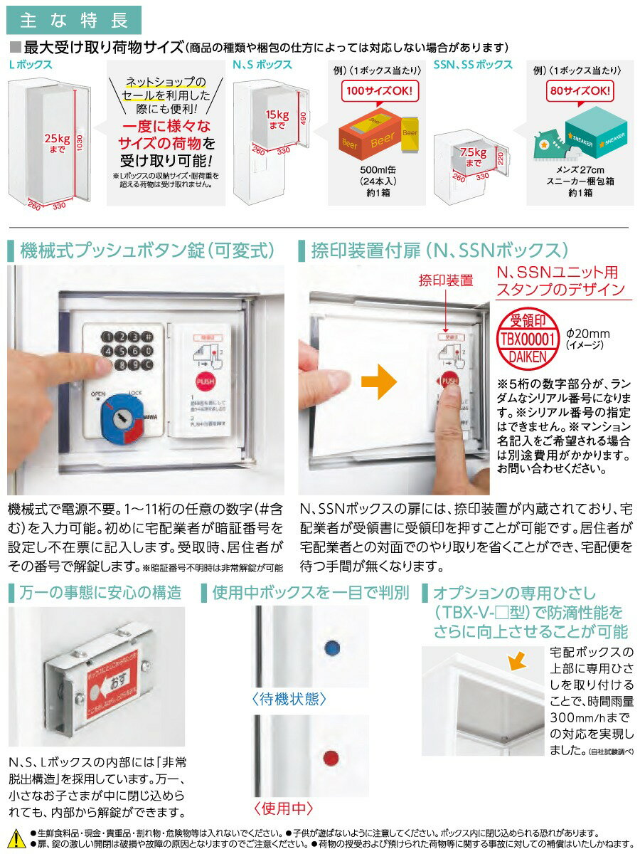 商 品 詳 細商品名共有仕様宅配ボックス【TBX-F2SS 標準扉 SSユニット】 集合住宅 アパート マンションサイズ幅400mm×高さ1080mm×奥行き325mm材質SGCC〈溶融亜鉛めっき鋼板/粉体焼付塗装〉質量19.0kg仕様施解錠方式:機械式プッシュボタン錠(可変暗証番号方式) 基本機能:受取り 着荷連絡:伝票にボックス番号および暗証番号を記入し、郵便受に差し入れる ※捺印装置は付いておりません。特長・前入れ前出し ・防滴仕様で屋外でも設置可能、ハイツ・アパートなどに最適 ・後付設置や、スペースに合わせた上下左右様々な連結が可能 ・電気配線工事不要で、年間の保守点検費が不要付属品※共通部品セット【マスターキー:2本/居住者用操作説明シール:1枚/業者用操作説明シール:1枚/ナンバーシール:ボックス数/取扱説明書:1部/工事説明書:1部】 ●壁面固定用樹脂プラグ:4本/壁面固定用呼び5トラスタッピン:4本/平座金:4ヶ/ゴムワッシャー:16枚/連結用M6トラスねじ:6本/連結用M6袋ナット:6ヶ/連結穴隠しシール:12枚 ※共通部品セットは1物件に1セットとなります。備考※メーカー直送の為代引き支払いできません。 ※代引き支払いのご注文は自動キャンセルをさせて頂きます。 ※沖縄県・離島は配送出来ません ※配送時間のご指定は出来ません ※日曜・祝日の配送は出来ません注意事項※当店では、設置工事等の対応は行っておりません。商品配送のみのご対応となります。 ※床置きの場合、別売のオプション幅木(床面設置用)が必ず必要となります。 ※雨等の水がかかっても収納部が濡れないように配慮された防滴仕様ではありますが、防水構造ではないため、強風雨等の諸条件では収納部が濡れてしまう可能性があります。120mm/h相当の雨水試験実施済(社内設備にて実施)。なお、多雪地域では風除室への設置を推奨します。 ※宅配ボックスを設置する際には、1現場につき受領印付きのユニットを1つ設置することを推奨します。 ※床面アンカー固定では、床面+壁面固定を推奨。または床面固定。 ※幅木を使用し、さらに上下連結を行った場合の全高が「1600mm」を超える場合は、床面固定だけでなく必ず壁面固定も行ってください。 ※配達先が不在である場合のみ使用してください。 ※生鮮食料品・現金・貴重品・割れ物・危険物等は入れないでください。 ※子供が遊ばないように注意してください。ボックス内に閉じ込められる恐れがあります。 ※扉、錠の激しい開閉は破損や故障の原因となりますのでご注意ください。 ※荷物の授受および預けられた荷物等に関する事故に対しての補償はいたしかねます。 ※イメージ画像は使用するブラウザ・モニターにより色が違って見える場合があります。施工について※施工はお客様にて責任を持ってご手配ください。 ※施工には、専門的な知識と、工具、技術が必要となります。 ※お近くの施工業者様に設置を依頼して頂くようお願い致します。 ※お近くの施工業者様に相談の上、設置を依頼して頂くようお願い致します。関連商品検索はこちらから おしゃれ・シンプルなおすすめ集合住宅用ポストを多数準備 屋外用・屋内用 マンション・アパート等の集合住宅に各メーカーの商品をラインナップ【キョーワナスタ(NASTA)】プチ宅・プチ宅unit・D-ALL・Qual クオール・公団型集合住宅用・防滴?屋内用【ダイケン】TBX-1F・TBX-2F・ポステックコーワソニア・杉田エース・神栄ホームクリエイトなど1戸用・2戸用・3戸用・4戸用・6戸用・8戸用・10戸用・12戸用・18戸用集合住宅用郵便ポストをご購入の方は通常1枚800円の部屋番号プレートが500円に!必要数量分をポストと同時に買い物カゴに入れてご注文をお願いいたします。[お得なオリジナルプレートはこちらから ] ★集合住宅用商品 売れてる人気ランキングはこちら ●集合住宅用宅配のカテゴリ一覧 ●1戸連結タイプのカテゴリ一覧 ●2戸連結タイプのカテゴリ一覧 ●3戸連結タイプのカテゴリ一覧 ●4戸連結タイプのカテゴリ一覧 ●その他連結タイプのカテゴリ一覧 ●関連商品 ダイケン DAIKEN TBX-V-G ひさし ダークグレー スチール製 4,470円ダイケン DAIKEN TBX-V-W ひさし ホワイト スチール製 4,470円ダイケン DAIKEN TBX-H-G 幅木(床面固定用) ダークグレー スチール製 7,750円ダイケン DAIKEN TBX-H-W 幅木(床面設置用) ホワイト スチール製 7,770円ダイケン DAIKEN TBX-HS 幅木(床面設置用) ステンレス製 10,070円 ダイケン DAIKEN TBX-H300-G 幅木(床面固定用) ダークグレー 13,750円ダイケン DAIKEN TBX-H300-W 幅木(床面固定用) ホワイト 13,770円ダイケン DAIKEN TBX-F・G用ポールセット TBX-PZ ブラック 19,860円