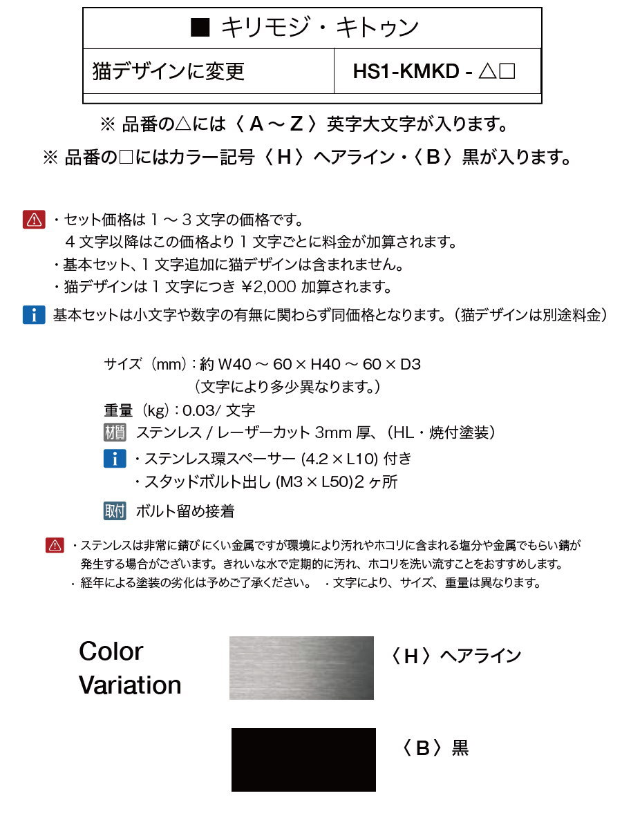 商 品 詳 細商品名オンリーワンクラブ キリモジ ・キトゥン KirikojiKitten 猫デザインに変更 ヘアラインHS1-KMKD-△Hサイズ(mm)文字寸法表をご確認ください。重量約0.03kg 1文字あたりの重量材質本体:ステンレス(3mm厚)/ヘアライン仕上げ仕様仕様1:取付方法はボンド・ボルト併用です。(ボンドは別途市販品をご用意ください。) 仕様2:スタッドボルト出し(M3×L50)2ヶ所 仕様3:ステンレス環スペーサー(4.2×L10)付き 仕様4:専用書体補足事項※別注サイズも承ります(別途お見積り。お問い合わせください。)ご注文方法STEP-1:ご注文時の表札名記入に名前をご記入ください。 STEP-2:後日、レイアウトサンプルをメールにてお送り致します。 STEP-3:お客様確認・承認後、発注となります。 ※レイアウトの作成は3案目より有料¥1000となり、受注に至らない場合でも料金が発生しますので予めご了承ください。 ※デザイン確認後、発注以降のキャンセルはお受け出来ません。ご了承下さい。備考※沖縄・離島は別途送料がかかります。事前にお問い合わせ下さい。注意事項※単品販売はできません。 ※書体変更不可/サイズ変更不可 ※1文字追加の価格です。 ※文字により、サイズ、重量は異なります。 ※ステンレスは非常に錆びにくい金属ですが環境により汚れやホコリに含まれる塩分や金属でもらい錆が発生する場合がございます。きれいな水で定期的に汚れ、ホコリを洗い流すことをおすすめします。経年による塗装の劣化は予めご了承願います。 ※イメージ画像は使用するブラウザ・モニターにより色が違って見える場合があります。 ◆表札は不具合がある商品以外は一切返品交換できません。 ◆重量やサイズなどの理由で設置できない場合でも一切返品交換はできません。 ◆重量などで設置にご心配な場合は、必ず事前に当店までご相談ください。施工について※施工はお客様にて責任を持ってご手配ください。 ※施工には、専門的な知識と、工具、技術が必要となります。 ※お近くの施工業者様に設置を依頼して頂くようお願い致します。 ※お近くの施工業者様に相談の上、設置を依頼して頂くようお願い致します。 ご希望の文字をご購入手続きの備考欄にお書きください関連商品検索はこちらから 【各種表札ラインナップ】ステンレス アイアン 切り文字 タイル ガラス アクリル 真鍮 シール ステッカー 木製?バックライト付き?正方形 長方形 かわいい表札?おしゃれな表札 様々な素材の表札を多数のデザインから選べるオーダーメイド表札をラインナップ。作成前にレイアウトの確認ができる商品も取り揃えておりますので安心してご依頼下さい取付け方は接着剤や両面テープでの貼り付けタイプや差し込みタイプ・取付用金具での戸建て用・マンション用に対応した施工方法がございます。当店おすすめ表札・ランキングをご紹介しております。ランキングページから、お求めの表札を検索する事ができます。 ★表札 売れてる人気ランキングはこちら ●表札 タイルのカテゴリ ●表札 ステンレスのカテゴリ ●表札 アイアンのカテゴリ ●表札 おしゃれの検索結果 ●表札 手作りの検索結果 ●表札 かわいいの検索結果 ●関連商品 オンリーワンクラブ キリモジ・キトゥン Kirikojikitten 基本セット(1〜3文字) ブラック HS1-KMK13B 22,000円オンリーワンクラブ キリモジ・キトゥン Kirikojikitten 基本セット(1〜3文字) ヘアライン HS1-KMK13H 22,000円オンリーワンクラブ キリモジ ・キトゥン KirikojiKitten オプション1文字追加 ブラック HS1-KMK-〇B 5,900円オンリーワンクラブ キリモジ ・キトゥン KirikojiKitten オプション1文字追加 ヘアライン HS1-KMK-〇H 5,900円オンリーワンクラブ キリモジ ・キトゥン KirikojiKitten 猫デザインに変更 ブラック HS1-KMKD-△B 1,870円 オンリーワンクラブ キリモジ ・キトゥン KirikojiKitten 猫デザインに変更 ヘアライン HS1-KMKD-△H 1,870円