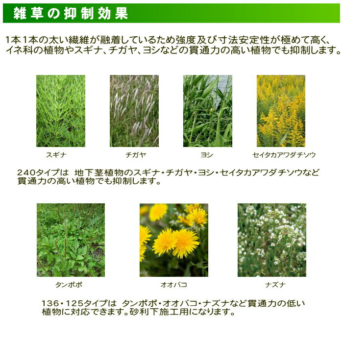 商 品 詳 細商品名ザバーン防草シート350 グリーン 1M×30M 防草対策 防草砂利 除草 草取り 草むしり デュポン プロが選ぶ高品質 雑草対策 防草対策 除草 草取り デュポン グリーンビスタ材質【シート】ポリプロピレン4層スパンボンド不織布サイズ【シート】幅1M×長さ30M 厚さ0.8mm備考発送の目安:平日午前中のご注文にて1〜2営業日以内に発送。 平日午後および土曜日曜祝日のご注文は翌営業日受注扱いになります。 ※メーカー直送のため、代引き決済はできません スギナ、ヨシ、笹、セイタカアワダチソウなど強い雑草でも抑制し、シート上に砕石を敷けば駐車場にも使用できます。もちろん車両がのっても大丈夫です。 コ型止めピンで固定する場合は地中の埋設物に十分注意して施工を行なってください。施工について※施工はお客様にて責任を持ってご手配ください。 ※施工には、専門的な知識と、工具、技術が必要となります。 ※お近くの施工業者様に設置を依頼して頂くようお願い致します。 ※お近くの施工業者様に相談の上、設置を依頼して頂くようお願い致します。ザバーン®防草シートは米国デュポン社が開発した特殊な不織布です。雑草が生えている場所を草刈りし、ザバーン®を敷くだけで長年雑草の成長を抑制することができます。ザバーン®は化学薬品を一切使用せず雑草を抑制します。これは紫外線を遮断し雑草の光合成を抑制することにより防草効果を発揮します。ザバーン®は強靭なシートですのでイネ科等の貫通力のある雑草でも貫通できません。又、紫外線劣化防止加工で長年の暴露にも耐えます。 ★雑草対策/人工芝 売れてる人気ランキングはこちら ●関連商品 グリーンフィールド リアリーターフ ミドルプラス(パイル25mm) 1M×10M RET25-1-10K 46,800円グリーンフィールド ザバーン防草シート専用 コ型止めピンH15cm 50個入り 1,800円グリーンフィールド ザバーン防草シート専用 防草ワッシャー グリーン 50個入り 1,900円JOTO ハウスステップ 収納庫付き 400×900×350mm 27,990円ユニオンビズ メモリーターフスウィートオプション タフネイル(高強度U字ピン)100本入 人工芝と同時購入で送料無料 UP-185 13,970円 ユニオンビズ メモリーターフスウィートオプション タフストップ(高密度防草シート)巾1m×長さ50m 人工芝と同時購入で送料無料 BS-1205 30,250円ユニオンビズ メモリーターフスウィートオプション ターポリンシート(接着剤塗布用ジョイントシート)巾約15cm×長さ20m 人工芝と同時購入で送料無料 TSG-20 13,640円ユニオンビズ メモリーターフスウィートオプション タフグレー(人工芝専用接着剤) 人工芝と同時購入で送料無料 ST-05 13,310円グリーンフィールド 防草シート専用 GFボンド 3,300円