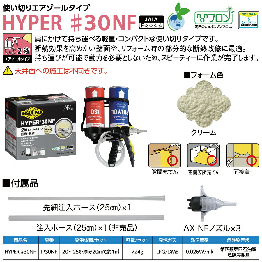 【ポイントUP中】断熱材 エービーシー商会 簡易発泡硬質ウレタンフォーム インサルパック 2液タイプ 商品名:HYPER #30NF 品番:IP30NF 6セット/1箱 使い切りエアゾールタイプ ABC商会 断熱性 省エネ 作業性 ノンフロン JAIA-F☆☆☆☆