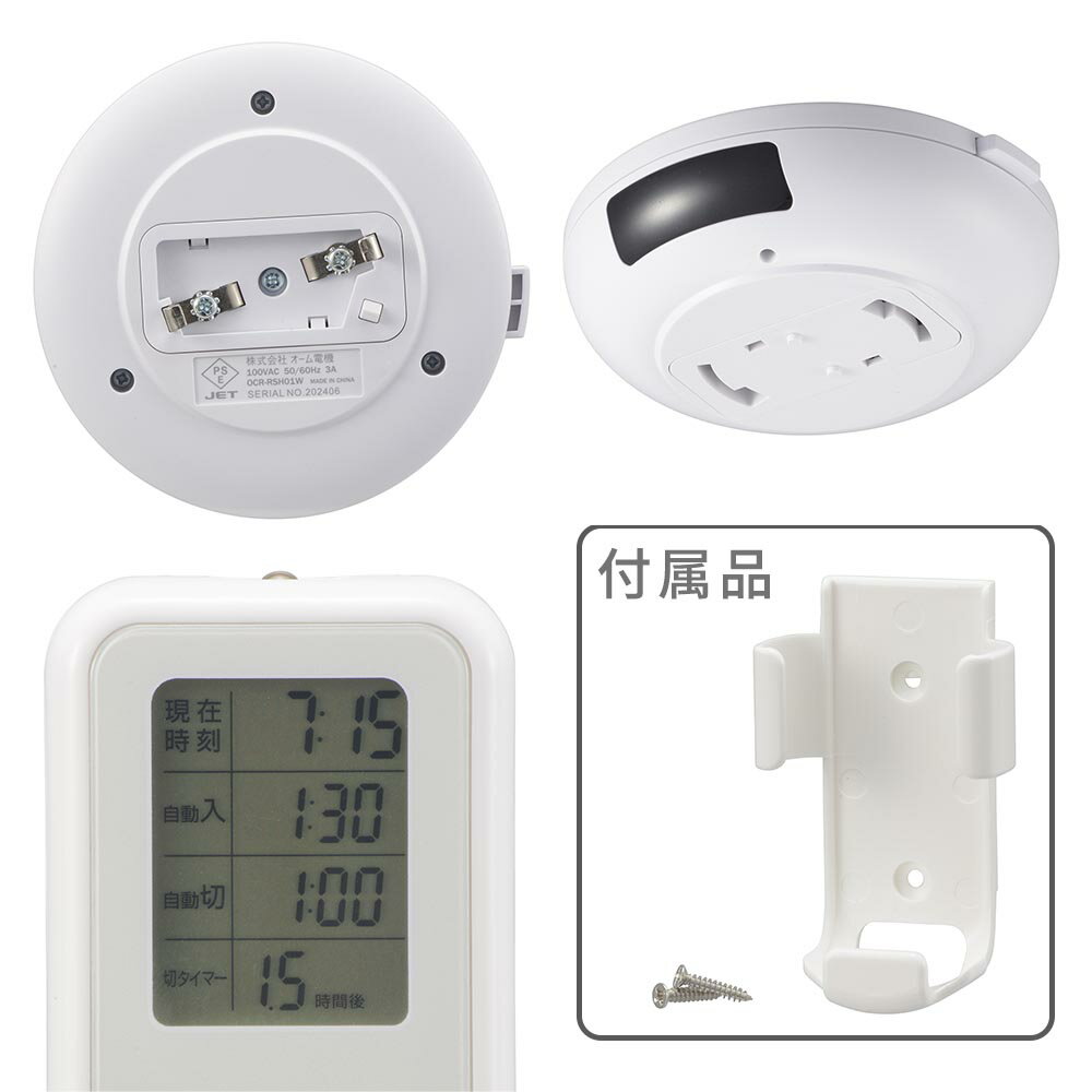 特長 ●赤外線リモコンで離れた場所から照明器具をオン・オフ●文字が見やすい大型液晶リモコン●毎日同じ時刻に繰り返し「自動オン・オフ」も可能、防犯対策に●日照不足の暗い北向き・窓なし部屋での目覚まし照明用にも●5時間後まで自動オフができる切タイマー機能付き●落下防止の「固定ロック機能」付き●通電ランプ付き●取り付けは照明器具と天井の引掛シーリングの間に受信機本体をセットするだけ、面倒な配線や工事などの必要なし●使用できる照明器具(天井引掛けシーリング使用の照明器具)・洋風・和風ペンダントライト・シャンデリア・引掛けソケット使用の電球・小型シーリングライト(直径30cm以下)●使用できない照明器具・天井直付タイプの大型シーリングライト 商品仕様 ≪受信機本体≫●入 力:AC100V 50Hz/60Hz●定格容量:3A●外形寸法:(約)直径100×高さ42mm●量 質:約100g≪リモコン≫●使用電池:単4形乾電池×2本(別売)●外形寸法:(約)幅48×高さ126×奥行20 mm●有効距離:約5m(障害物のない場合)●質 量:約55g(乾電池除く)●付属品:リモコンホルダー・ネジ×2本・保証書付取扱説明書 【ご注意】 ※自動入・自動切・切タイマー設定後の使用時においては、リモコンの送信部を本体の受信部に向けて置いておく必要があります。※5kg以上の照明器具に使用しないでください。※5kgを超える照明器具の場合、チェーンなどを使用してください。(照明器具の落下によるけがの原因になります。)※定格容量3A以下の照明器具を使用してください。(容量目安 :蛍光灯・電球形蛍光灯の場合…150Wまで 、白熱灯の場合…300Wまで 、インバーター照明器具の場合…120Wまで ※容量を超えると、故障や発火の原因となります。)メーカー取寄品