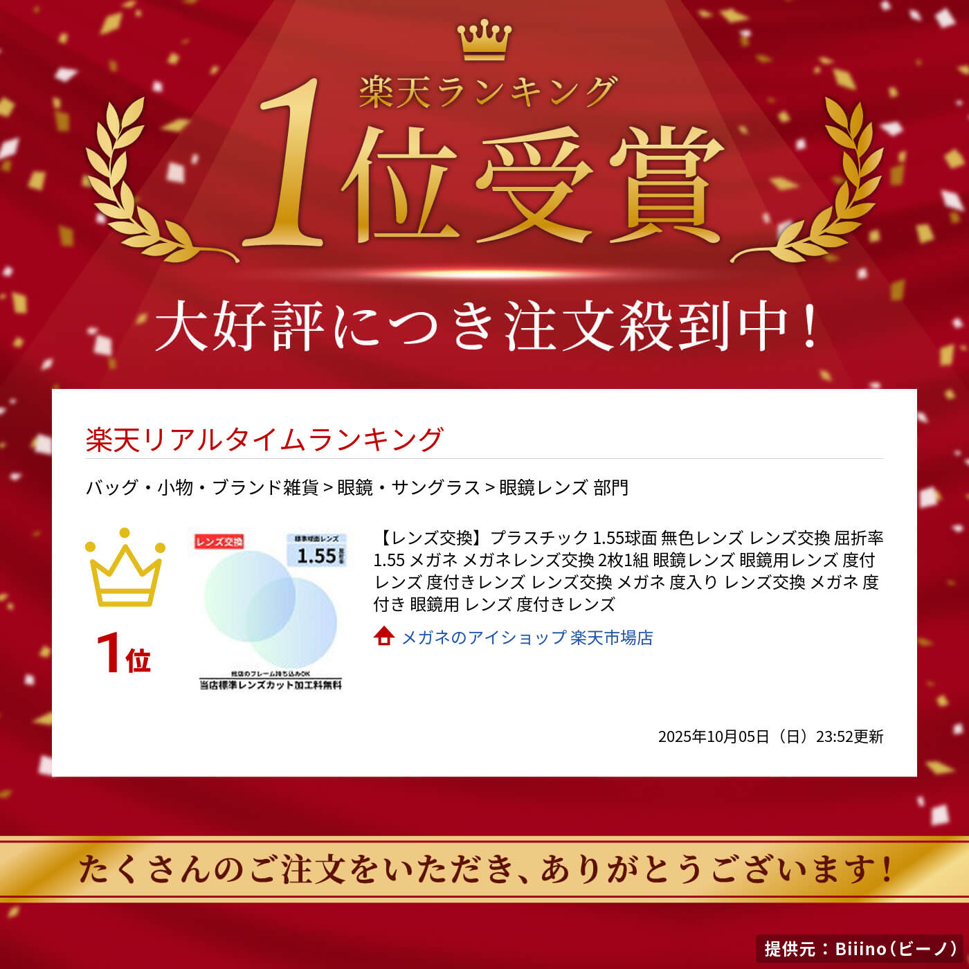 【レンズ交換】プラスチック 1.55球面 無色レンズ レンズ交換 屈折率1.55 メガネ メガネレンズ交換 2枚1組 眼鏡レンズ 眼鏡用レンズ 度付レンズ 度付きレンズ レンズ交換 メガネ 度入り レンズ交換 メガネ 度付き 眼鏡用 レンズ 度付きレンズ お使いのメガネをそのまま使える ~レンズ交換をご注文の方へ~●簡単3ステップ●1. レンズ注文注文方法が分からなければ、お問い合わせにてご連絡ください2. フレーム送付発送方法は何でもOK!(日本郵便・ヤマト運輸・佐川急便など)3. 返送までお待ちくださいフレーム到着後、最短即日発送! 迅速・丁寧に作製致します。●ステップごとの注意点●1. レンズ注文「交換したいレンズの度数が分かる場合」ご希望のレンズ度数をご注文時に選択ください「交換したいレンズの度数が分からない場合」以前に購入した眼鏡店に確認するか、もしくは眼科にて処方箋@の取得をお願い致します。「送ったメガネと同じ度数にしたい場合」・交換したいメガネと同じ度数の場合そのままメガネを下記の住所へ送付お願い致します。同じ度数にしたいメガネと交換したいメガネが違う場合・交換したいメガネと一緒に同送してください。※ご選択いただいた度数が製作範囲外などの、度数の選び方にて不備がある場合、確認が必要となるため連絡が取れるまで作製をストップさせていただきます。その場合、納期が予定より長くなる可能性がございますことご了承お願い致します。不備がある場合、お問い合わせもしくはメールにてご連絡させていただきます。2. フレームを送付★送付先住所★〒581-0017大阪府八尾市高美町1-3-22メガネのアイショップTEL 072-992-7047〇破損しやすいフレーム〇TR90素材樹脂・ウルテム素材ファッションフレーム(100円均一や雑貨店の安価なフレーム)劣化した古いフレーム〇レンズ交換不可のフレーム〇特殊加工が必要なフレーム高額なフレーム(貴金属・べっ甲・宝石)破損しているフレームネジが抜けない・レンズが外れないフレーム※実店舗の経験を活かして丁寧に作製を行いますが、まれにレンズ交換中にフレームの破損が発生する場合がございますが、当店で補償は致しかねます。4. 返送までお待ちください★当店のこだわり★強度のレンズを薄く美しく見せる特別加工は無料サービスでさせていただきます。レンズの厚みを極力薄く見えるように、バフできれいに磨き上げ、滑らかに仕上げます。可能な限り、即日仕上げ!土日祝も発送可能です!【追加費用について】※製作範囲外や特注、追加コーティングをオプションで付けたい場合は、別途ご連絡致します。※その他別途追加費用がある場合に関しましても、ご連絡致します。 5