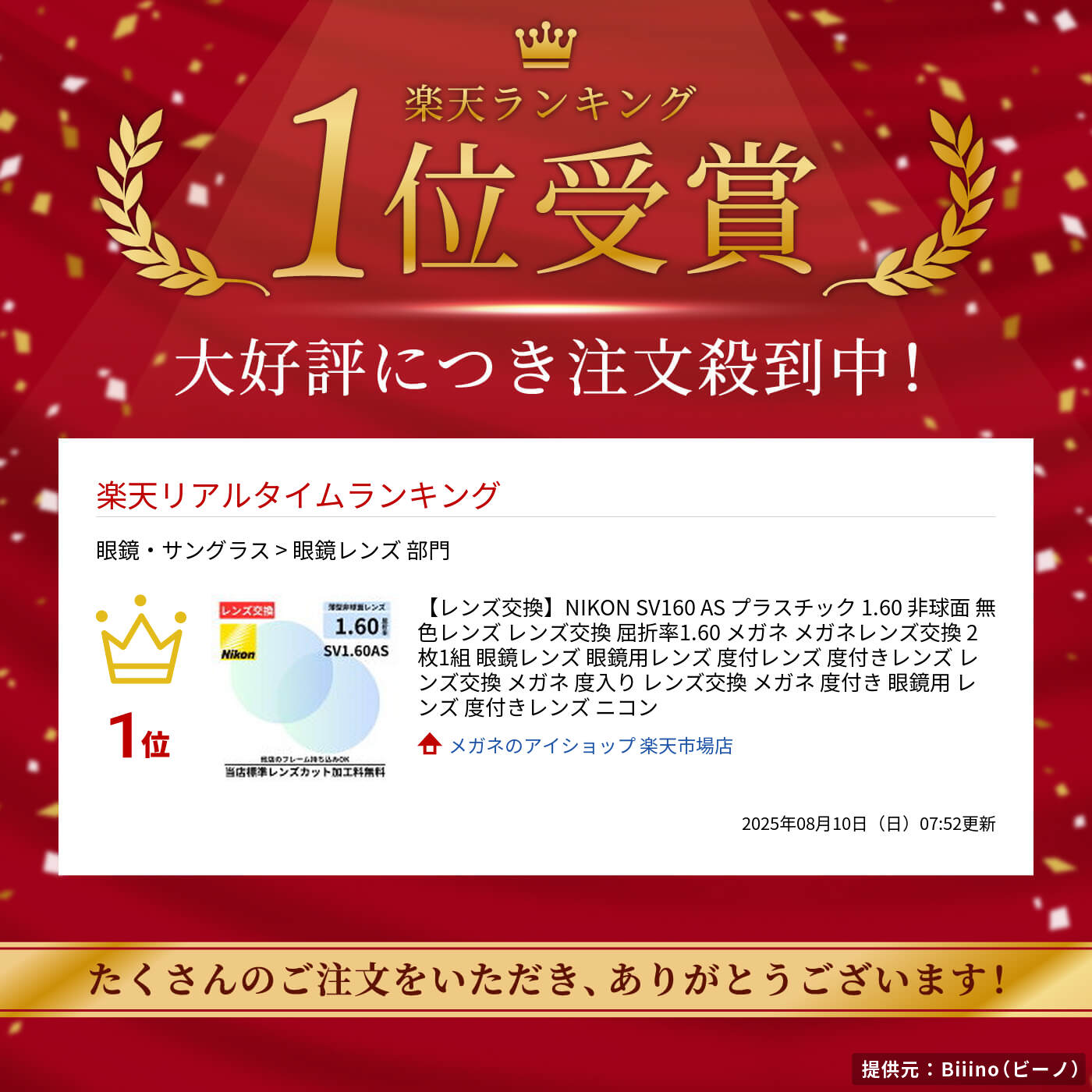 【レンズ交換】NIKON SV160 AS プラスチック 1.60 非球面 無色レンズ レンズ交換 屈折率1.60 メガネ メガネレンズ交換 2枚1組 眼鏡レンズ 眼鏡用レンズ 度付レンズ 度付きレンズ レンズ交換 メガネ 度入り レンズ交換 メガネ 度付き 眼鏡用 レンズ 度付きレンズ ニコン 【Nikon SV160 AS】 お使いのメガネをそのまま使える ~レンズ交換をご注文の方へ~●簡単3ステップ●1. レンズ注文注文方法が分からなければ、お問い合わせにてご連絡ください2. フレーム送付発送方法は何でもOK!(日本郵便・ヤマト運輸・佐川急便など)3. 返送までお待ちくださいフレーム到着後、最短即日発送! 迅速・丁寧に作製致します。●ステップごとの注意点●1. レンズ注文「交換したいレンズの度数が分かる場合」ご希望のレンズ度数をご注文時に選択ください「交換したいレンズの度数が分からない場合」以前に購入した眼鏡店に確認するか、もしくは眼科にて処方箋@の取得をお願い致します。「送ったメガネと同じ度数にしたい場合」・交換したいメガネと同じ度数の場合そのままメガネを下記の住所へ送付お願い致します。同じ度数にしたいメガネと交換したいメガネが違う場合・交換したいメガネと一緒に同送してください。※ご選択いただいた度数が製作範囲外などの、度数の選び方にて不備がある場合、確認が必要となるため連絡が取れるまで作製をストップさせていただきます。その場合、納期が予定より長くなる可能性がございますことご了承お願い致します。不備がある場合、お問い合わせもしくはメールにてご連絡させていただきます。2. フレームを送付★送付先住所★〒581-0017大阪府八尾市高美町1-3-22メガネのアイショップTEL 072-992-7047〇破損しやすいフレーム〇TR90素材樹脂・ウルテム素材ファッションフレーム(100円均一や雑貨店の安価なフレーム)劣化した古いフレーム〇レンズ交換不可のフレーム〇特殊加工が必要なフレーム高額なフレーム(貴金属・べっ甲・宝石)破損しているフレームネジが抜けない・レンズが外れないフレーム※実店舗の経験を活かして丁寧に作製を行いますが、まれにレンズ交換中にフレームの破損が発生する場合がございますが、当店で補償は致しかねます。4. 返送までお待ちください★当店のこだわり★強度のレンズを薄く美しく見せる特別加工は無料サービスでさせていただきます。レンズの厚みを極力薄く見えるように、バフできれいに磨き上げ、滑らかに仕上げます。可能な限り、即日仕上げ!土日祝も発送可能です!【追加費用について】※製作範囲外や特注、追加コーティングをオプションで付けたい場合は、別途ご連絡致します。※その他別途追加費用がある場合に関しましても、ご連絡致します。 5