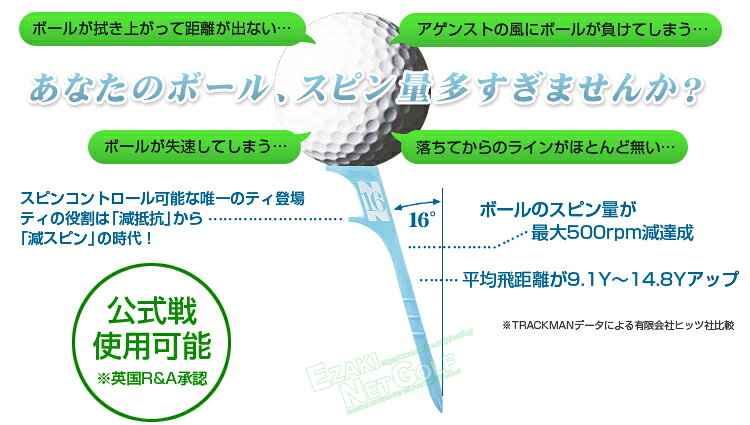 「理想的なスピン量」と「簡単なティアップ」を実現しました! ボールを乗せる皿の下の部分(N16のロゴの部分)を太くする事により、ティアップ時のたわみが 解消され、簡単にティアップする事ができるようになりました。 また、「まっすぐなティ」との比較実験により、理想的なスピン量と飛距離UPの効果が実証されました。 スピン量(256rpm減)/飛距離(9.1ヤードUP) ※メーカー発表の比較実験による。 素材 ABS 内容量 5本入り カラー ブルー、ピンク ルール 英国R&Aのゴルフ用具審査をクリアしています。公式戦での使用可