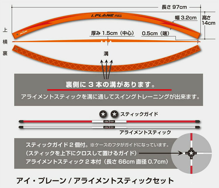 メーカー希望小売価格はメーカー商品タグに基づいて掲載していますツアートーナメントで生まれたスイング調整システム i.PLANE PROを使えば正しいスイングが身に付き、更にドローボールやフェードボール等の打ち分けができるようになります。 ゴルフのスイングは飛球線に対して IN to INの軌道になるのが正しく、そのようにスイングすることで身体と手が同調したスイングが身に付きます。 しかし練習場のマットのラインは直線で、さらにアライメントスティックをスタンスに沿って置いている方も多く、視界に入ればどうしても真っ直ぐのラインを意識してしまい、正しいスイングをするのが難しくなってしまいます。 どんなにいいスイングをしているツアープロでも、毎週ツアーを戦っているとスイングやアライメントにズレが生じてきます。 ツアープロも練習にi.PLANE PROを取り入れ、スイングの矯正やアドレスのチェックに役立てています。 素材 アイプレーン:ポリカーボネート アライメントスティック:グラスファイバー サイズ アイプレーン:長さ97cm×幅3.2cm×高さ14cm 厚み1.5cm(中央)、0.5cm(端) アライメントスティック:長さ66cm×直径0.7cm 内容 アイプレーン×1 スティックガイド×2(ケースのフタがガイドになっています) アライメントスティック×2