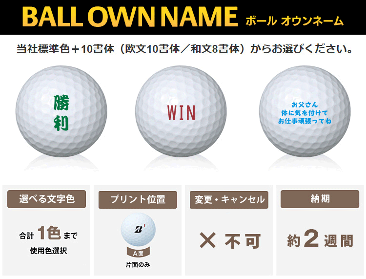 購入前に必ずお読み下さい。 こちらの商品はメーカーへの発注商品となります。 オウンネームの為、こちらの商品はキャンセル、変更、返品などはお受けできません。購入前に必ずお読み下さい。 こちらの商品はメーカーへの発注商品となります。 オウンネームの為、こちらの商品はキャンセル、スペック変更、返品などはお受けできません。 ご注文確認受付後、発注いたしますので、約2~3週間後に発送いたします。 ※プリントは片面のみです ※文字の大きさは字数によって変わります ※ノーネーム(名入れなし)のご注文はできません ※2~3行の場合はセンター合わせとなります ※ボールNo指定可能(ご希望は備考欄にご記入お願いします) ※メタリックカラーは標準色と比べ、プリントの耐久性が弱くなりますのでご了承ください。 ※指定の色と出来上がりの色が印刷の都合上、若干異なる場合があります。 ※メタリックカラーはホワイトのボールのみ対応となります。 ボールタイプ ディスタンス 構造 3ピース コア スピードマッスルコア インナーカバー Neo HR-DRIVEインナーカバー アウターカバー Neo BOOST POWERカバー ディンプル ストレートデルタウィング・ディンプル338 カラー ホワイト ボールナンバー 0、1、2、3、4、5、7、8 推奨ヘッドスピード 34~44m/s ボール軟らかさ 弾道 高 日本製 ・マイナーチェンジ変更(2025年8月7日) 前作からの変更点 (旧)BIGマッスルコア → (新)スピードマッスルコア (旧)HR-DRIVEインナーカバー → (新)Neo HR-DRIVEインナーカバー サイドマーク変更