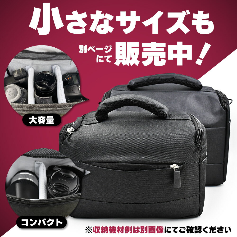 クッション性抜群の耐衝撃素材を使用。 内部は面ファスナーで固定できる区分用クッションで自由に仕切りを作れます。 中身が確認しやすい、一目瞭然のメッシュポケット。ポケット多数で収納力◎ 前面にはSDカードや小物をサッと取り出せるファスナーポケット。 本体側部にはクロスや封筒などが収納できるフリーポケットx2。 厚手で丈夫な持ち手付きなのでハンドキャリーにも◎ ベルトループによる腰付けでウエストバッグとしても使え、工夫次第で様々な箇所に固定可能。 サイズ調整できるショルダーベルト。通気性が高く、肩の負荷を和らげるクッション付き。 【収納例】 カメラ2台分の収納や、交換用レンズの持ち歩きに◎ 収納機材:一眼レフカメラ、ミラーレスカメラ、レンズ2種類、充電器 小さなサイズの販売はこちら> 【素材】 ポリエステル、綿 【カラー】 ブラック 【重量】 約470g 【サイズ】 外寸:約25cmX約20.5cmX約15cm 内寸:約22cmX約13cm お支払い・配送について ・ご入金確認は楽天市場にて処理されております。前払い決済をご指定された場合はご入金確認後の発送となります。・お支払い期日を過ぎた場合は自動でキャンセルさせていただきます。お支払いについてはこちらをご参考くださいませ。・不明点や配送に問題が生じた場合は事前にご連絡をさせていただきますのでご了承ください。(長期間ご連絡がとれない際はやむを得ずキャンセルとさせていただきます)・当店では領収書の郵送対応は原則的にお受け付けしておりません。ご所望の際はご連絡ください。▲タップでページを見る▲