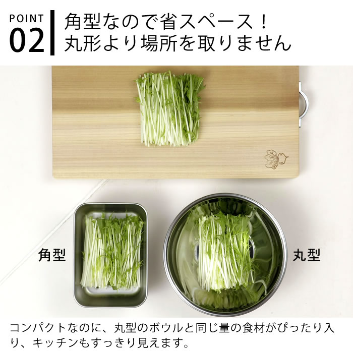 商品名 シリコンフタ付 角バット&ザル 各3個セット 商品詳細 サイズ(1個あたり) バット:約 W16.5×D11.8×H6.2cm ザル:約 W15.7×D11×H5.8cm フタ:約 W16.8×D12.3×H0.8cm 重量(1個あたり) バット:約152g ザル:約83g フタ:約54g 素材 バット・ザル:18-8ステンレス(アミ:14メッシュ) フタ:シリコーンゴム 仕様 食洗機、使用可。 原産国 日本 備考 ※18-8ステンレス製はサビに強く汚れもつきにくいですが、汚れの付着によるサビが発生する場合があります。汚れがひどくなる前に洗浄してください。 ※ザルは、たたいて水切り等をされますと、網部が変形したり、脚部が外れる原因となりますので避けてください。 ※電子レンジ・オーブンでのご使用はしないでください。 ※直火でのご使用はしないでください。 ※食器洗浄機はご使用できます。 ※異種金属と接触したまま保管しないでください。サビの原因になります。 ※フタは完全密閉にはなりません。傾けると液モレするため、保存の際は平らな所に置いてください。 ※その他、使用開始前に必ず取扱上のご注意をお読みください。 検索キーワード バット 調理 シリコンフタ付 角バット&ザル 各3個セット ザル セット バット 蓋付き 下ごしらえ 水切り 便利 四角 角型 深型 ざる コンパクト収納 省スペース 保存 ステンレス 日本製 燕三条 キッチン用品 調理器具 ラッピング ラッピングOK →詳細はこちらシリコンフタ付 角バット&ザル 各3個セット フタ付きで便利!スタッキングできてコンパクト角バット&ザル 各3個セット 歴史ある金属加工のまち、新潟県・燕三条で作られたシリコンフタ付 角バット&ザル 各3個セットです。 調理前の下ごしらえの際、食材を小分けするのに重宝します。 クロスに積み重ねられるので、限られたキッチンスペースでも幅を取らずに使用できます。 野菜などの水切り、揚げ物の油切り、貝類の砂抜き、具材の仕分けなど使い方はいろいろ♪ フタ付きで一時保存にも便利。バットにザルを入れたままフタをすることもできます◎ 使用しない時は、スタッキングして場所を取らずに収納できます。 素材には耐久性に優れた18-8ステンレスを使用。 職人が細部まで丁寧に仕上げ、永く安心して使える商品です。 関連商品 スタッキング角バット&ザル 各3個セット シリコンフタ付 角バット&ザルセット シリコンフタ付 角バット&ザル 各3個セット ママクック キッチンバット(フルセット) →シリーズ一覧を見る