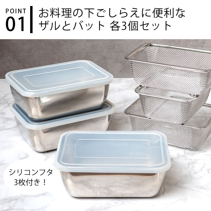 【11/25はポイント最大10倍祭♪】バット 調理 シリコンフタ付 角バット&ザル 各3個セット ザル セット バット 蓋付き ざる ステンレス 調理器具 便利 燕三条 省スペース 保存 深型 日本製 四角 角型 キッチン用品 コンパクト収納 下ごしらえ 水切り