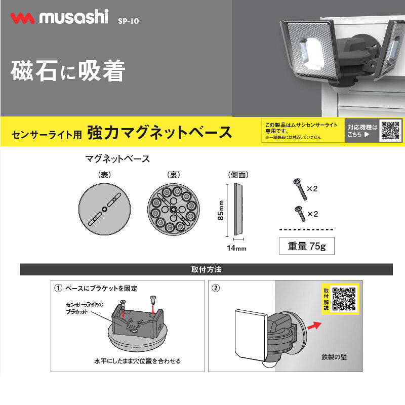 センサーライト用 強力マグネットベース ※この製品はムサシセンサーライト専用です。 ・強力磁石で簡単設置! ・品名:センサーライト用 強力マグネットベース ・品番:SP-10 ・本体サイズ:直径85mm×厚み14mm ・重量:75g ・付属品 マグネット×1 / 製品取付ネジ(長)×2 / 製品取付ネジ(短)×2 ■返品について お客様のご都合による返品・交換をご希望の場合は、商品到着後一週間以内にご連絡ください。 未開封・未使用品に限り、返品をお受けします。(※返品不可としている商品を除く) (※商品の初期不良による返品及び返金はお受けできません。) ※返品の際に発生する送料はお客様のご負担になります。 ※返品の場合の返金につきましては送料の返金は出来ません。 ※商品の初期不良による返品・別の商品への交換及び返金はいかなる場合においてもお受けできません。 (初期不良の場合は、検査済みの同新品商品をお届けします) ■送料無料商品のお客様都合によるご返品について こちらの商品は送料無料としておりますが、お客様都合によるご返品の場合は、ご注文商品発送の際に弊社が負担した送料(梱包・事務手数料含め)は差し引いてのご返金となります。予めご了承の上ご検討お願いします。 ■万一、お届けした商品に不具合があった場合は 商品到着後1週間以内にご連絡下さい。 迅速に検査済みの商品を発送させていただきます。 ※商品の初期不良による返品・別の商品への交換及び返金はいかなる場合においてもお受けできません。 (初期不良の場合は、検査済みの同新品商品をお届けします) 【責任の制限】 当店では、商品の品質・安全等について万全を期しておりますが、万が一商品不具合または商品の使用及びお届けの遅延等によりお客様に損害が生じた場合は、当店の故意または重大な過失がある場合を除いては、一切の責任を負いかねます。また、当店が責任を負う場合につきましても、当店の責任範囲は商品の売買代金を上限とさせていただきますので、予めご了承ください。 上記、ご了承いただいた上、ご検討お願い致します。・強力磁石で簡単設置!※この製品はムサシセンサーライト専用です。