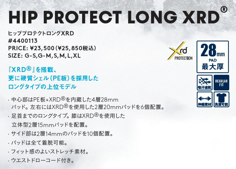当店で取り扱っている商品は全て安心の日本正規取扱品です。 「並行輸入品」等ではありませんのでご安心下さい。 eb's MOUNTAIN FURNITURE 【HIP PROTECT LONG XRD】 ヒッププロテクトエックスアールディー 軽量で柔軟性が高く、衝撃の90%を吸収する素材『XRD』を搭載、更に硬質シェル(PE板)を採用したeb'sの上位モデル!! ・中心部はPE板+XRDを内蔵した4層28mmパッド。 ・左右にはXRDを使用した2層20mmパッドを6個配置。 ・サイド部は2層14mmのパッドを10個配置。 ・足首までのロングタイプ。ひざはXRDを使用した立体型2層15mmパッドを配置 ・パッドは全て着脱可能。 ・フィット感のよいストレッチ素材。 ・ウエストドローコード付き。 【XRD】(エックスアールディー) 最先端の技術が集結したアクションスポーツに適した衝撃吸収素材。通常はライディングにストレスを感じさせない柔らかい状態を保つが、衝突時には瞬間的に素材が「硬化」し、体を衝撃から守る「シェル」を形成する。その衝撃吸収率は驚きの約90%。軽量で通気性も備える究極の素材です。 「PORON XRD」と言う名称は「XRD」の名称へ移行しました。エビスのプロテクターも従来あった「PORON XRD」から「XRD」へ名称を変更しております。性能的には全く同じになりますのでご安心ください。 【WARNING】 この商品はライディング中の怪我の危険性を最小限にするためのものであり、怪我を完全に防止する事をお約束するアイテムではありません。安全、怪我防止のため、自己レベルを認識した上でご使用下さい。 エビスのXRDを使用した定番モデル。防御性能としては上位のディフェンダーシリーズとスリムシリーズの中間となります。 ハイエンドまでは求めないけれども、シッカリとしたプロテクターがご希望であればこのモデルがおススメです。 サイズチャートのフィッティングは「しっかりとフィットさせた場合」のサイズチャートになります。製品自体がずれを防ぐために伸縮素材を使用したフィットタイプのプロテクターになります。 余裕が欲しかったり、境界で迷った場合はワンサイズ上のサイズをおススメします。 【品質管理・免責事項について】 プリント転写、柄の生地等にてカラーリングを行っているアイテムに関してはその工程上、掲載写真と100%同じ物は制作できません。一期一会とご理解頂き、掲載写真はカラーリングの一例とお考え下さい。 生産の過程上、縫製作業の糸の継ぎ目、擦過による小さな汚れ、プリント等のムラ、色移り、サイズの数センチのバラつき等が生じる場合がございます。予めご理解頂けます様、よろしくお願い致します。 【エビスマウンテンファニチャー・日本正規取扱店】 "自分達が本当に必要なモノ、全てのスノーボーダーから必要とされるモノを作りたい"その思いから1994年にスタートしたスノボ専門ブランドebsmission、その理念、スノーボードを愛する気持ちがハイクオリティなプロダクトを作るジャパンブランド。 メーカー希望小売価格はメーカーカタログに基づいて掲載しています
