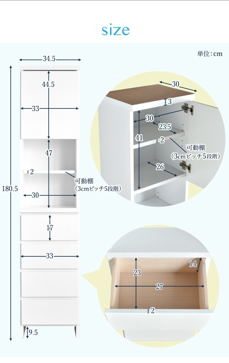 仕様 サイズ 外寸:幅29.5×奥行30×高さ180.5cm重量:約20kg 【スタッフ こばこばのおすすめポイント!】 ・デッドスペースをしっかり活用できるすき間収納・生活感を隠せる引き出し/扉付き収納 ・届いてすぐに使える完成品 ・リビングや脱衣所でも活躍!・安心安全の日本製(大川家具) 梱包サイズ 梱包1:34.5×34.5×97.5cm梱包2:34.5×34.5×86.5cm 耐荷重 約20kg可動棚:約10kg 素材 前面:PVC 塗装:ウレタン樹脂塗装(エナメル仕上げ) 天板:ポリエステル樹脂化粧板側面:プリント化粧繊維板 カラー ホワイト、モルタルグレー 生産国 日本(福岡県大川市) 送料 【送料無料(北海道・沖縄県・離島は送料別途)】 ※北海道・沖縄県・離島の場合はお問い合わせください。 ※別途送料が必要な場合には、送料をご了承いただいてからの発送となります。 備考 【完成品(上下段のみ取り付け)】 ※配送は全て宅配便(1人)での玄関渡しとなります。大型商品や重量商品、エレベーターの無い2階以上にお住まいのお客様は、玄関口までの搬入をお手伝いをお願いしており ます事をご了承ください。 ■お支払い方法・配送について詳しくはこちら