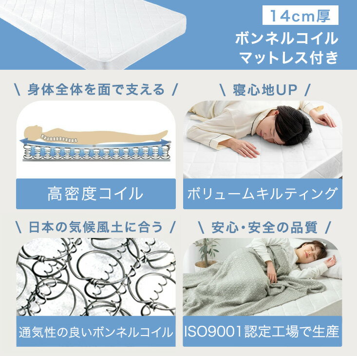 ▼メールでのお問い合わせはこちらf-sommelier@shop.rakuten.co.jp▼ ベッド 説明 ▼ ▼マットレス説明▼ 単品の販売ページはこちらです! ベッドフレーム単品 マットレス単品 ご一緒にいかがですか?BOXパッド付布団セットはこちら ▼ 他の収納ベッドのセットもございます ▼ 収納ベッド 大容量収納ベッド まだまだあります!>>ベッド・マットセット一覧はこちら<< 仕様 サイズ【シングル】 外寸:幅97×奥行209×高さ75cm 収納部:幅92×奥行193×高さ33cm(約586L) 【セミダブル】 外寸:約幅120×奥行209×高さ75cm 収納部:幅115×奥行193×高さ33cm(約732L) 【ダブル】 外寸:約幅140×奥行209×高さ75cm 収納部:幅135×奥行193×高さ33cm(約860L) コード長(共通):1.5m 【スタッフれおのおすすめポイント】 ・たっぷりしまえる跳ね上げ式収納ベッド ・開閉らくらくガス圧式 ・出し入れしやすい縦型オープン ・木目調×スチールで丈夫さとデザイン性を両立 ・便利&使いやすい多機能ヘッドボード …携帯やタブレットを立てられるスマホスタンド …雑誌や絵本をしまえるブックシェルフ …ほこりが入りにくいスライド式2口コンセント ・搬入らくらく!コンパクト梱包 重量 【シングル】約51kg 【セミダブル】約63kg 【ダブル】約70kg 耐荷重 【シングル】約300kg 【セミダブル】約350kg 【ダブル】約400kg 素材 強化紙化粧繊維板、スチール カラーウォールナット×ブラックホワイトウォッシ×ホワイト 梱包サイズ 【シングル】 (1)15×37×101cm(約26kg) (2)21×38×101cm(約28kg) 【セミダブル】 (1)15×37×121cm(約26kg) (2)17×37×123cm(約30kg) (3)9×26×123cm(約10kg) 【ダブル】 (1)15×37×141cm(約26kg) (2)17×37×143cm(約34kg) (3)9×26×143cm(約13kg) 備考 【組立品(大人2名で約2時間)】【中国製】 ※配送は全て宅配便(1人)での玄関渡しとなります。大型商品や重量商品、エレベーターの無い2階以上にお住まいのお客様は、玄関口までの搬入をお手伝いをお願いしております事をご了承ください。 ※よりスムーズに組み立てていただくために、電動ドライバーのご使用をおすすめします。 ※組み立て直後はシリンダー内のガス圧が高くなっており、床フレームを下げるのに力が要る場合があります。強めの力で下げていただくか2人以上で垂直した方向に力をかけるとスムーズに下げることができます。 ※1度下げてマットレスを載せると、床フレームに均等に力がかかるため1人でも下げられますのでご安心ください。 マットレス の仕様 サイズ 【シングル】 幅97×奥行195×高さ14cm コイル数:320個【セミダブル】 幅120×奥行195×高さ14cm コイル数:416個【ダブル】 幅140×奥行195×高さ14cm コイル数:480個 【スタッフひーちゃんのおすすめポイント!】 ・身体を面で支え、硬めの寝心地のボンネルコイルマットレス ・薄型だけど、床に敷いても感底付き感なし ・パイピングを施した高いデザイン性 ・ISO9001認定工場で生産した安心の品質 重量 シングル:約13kgセミダブル:約16kgダブル:約18kg 素材 表・側面:プリント生地(ポリエステル100%) 裏面:不織布 内部: ボンネルコイルスプリング (線径2.1mm) カラー ホワイト、ブラック 梱包サイズ 【シングル】 幅30.5×奥行30.5×高さ98cm【セミダブル】 幅32.5×奥行32.5×高さ121cm【ダブル】 幅32.5×奥行32.5×高さ141cm 備考 【中国製】 ※配送は全て宅配便(1人)での玄関渡しとなります。大型商品や重量商品、エレベーターの無い2階以上にお住まいのお客様は、玄関口までの搬入をお手伝いをお願いしております事をご了承ください。 ※マットレスは柔らかい素材で作られてますので、保存期間中の置き方や運搬の仕方、また測り方によって多少サイズに誤差が生じる場合がございます。予めご了承下さい。 ※ウレタンを使用しているマットレスは、直射日光や蛍光灯の影響によって変色することがあります。 これはウレタンの特性であり、品質や使用上の性能には問題ありません。 送料 【北海道・沖縄県・離島は別途送料がかかります。】 ※別途送料が必要な場合には、送料をご了承いただいてからの発送となります。