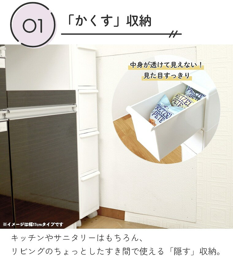 商品名 【キャスター付き】ちょっとしたすき間で使える「隠す」収納 スリムストレージ ファイントールストッカー 幅14cm・幅17cm・幅25.5cm FTS-4L TS-4L MS-4L ライクイット Like-it ライクイット サイズ(幅14cmタイプ・FTS-4L) (約)幅140×奥行465×高さ830mm 【引出し内寸】※全段共通サイズ (約)幅98×奥行429×高さ152mm サイズ(幅17cmタイプ・TS-4L) (約)幅170×奥行465×高さ830mm 【引出し内寸】※全段共通サイズ (約)幅130×奥行434×高さ152mm サイズ(幅25.5cmタイプ・MS-4L) (約)幅255×奥行465×高さ830mm 【引出し内寸】※全段共通サイズ (約)幅213×奥行431×高さ162mm 材質 ポリプロピレン 重量 幅14cmタイプ:(約)3500g幅17cmタイプ:(約)4800g幅25.5cmタイプ:(約)6300g 生産国 日本 一部地域によっては別途送料を頂いております。詳しくはお問い合わせ下さい。 ご覧になる環境によって実物と色が多少異なる場合もございます。隙間収納 すき間収納 14cm 17cm 25.5cm キャスター付き 4段 Like-it ライクイット ボトルを立てたまま収納できる!高さの違う3段の引き出し「111L」シリーズもオススメ!