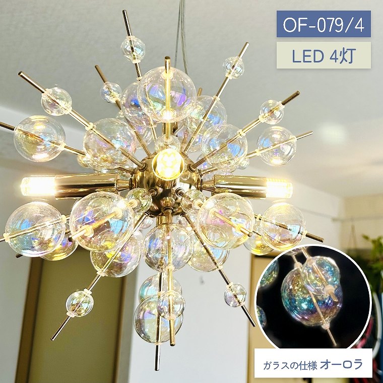 バブルシャンデリア LED 照明 4灯 ミニサイズ 天井照明 おしゃれ かわいい きれい ダイニング リビング 寝室 店舗 サロン 美容院 美容室 バー 飲食店 新築 バブルランプ モダン ゴールド シャンデリア OF-076 オーロラガラス シーリングライト LED対応