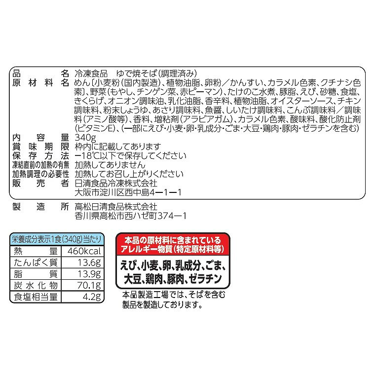 原材料名 めん〔小麦粉(国内製造)、植物油脂、卵粉/かんすい、カラメル色素、クチナシ色素〕、野菜(もやし、チンゲン菜、赤ピーマン)、たけのこ水煮、豚脂、えび、砂糖、食塩、きくらげ、オニオン調味油、乳化油脂、香辛料、植物油脂、オイスターソース、チキン調味料、粉末しょうゆ、あさり調味料、魚醤、しいたけ調味料、こんぶ調味料/調味料(アミノ酸等)、香料、増粘剤(アラビアガム)、カラメル色素、酸味料、酸化防止剤(ビタミンE)、(一部にえび・小麦・卵・乳成分・ごま・大豆・鶏肉・豚肉・ゼラチンを含む) 内容量 340g 栄養成分表示1食(340g)当たり 熱量460kcal、たんぱく質13.5g、脂質13.9g、炭水化物70.1g、食塩相当量4.2g 本品の原材料に含まれているアレルギー物質(特定原材料等) えび・小麦・卵・乳成分・ごま・大豆・鶏肉・豚肉・ゼラチン本品製造工場では、そばを含む製品を製造しております。 保存方法 -18℃以下で保存してください 凍結直前の加熱の有無 加熱してありません 加熱調理の必要性 加熱してお召し上がりください 販売者 日清食品冷凍株式会社 大阪市淀川区西中島4-1-1 製造所 高松日清食品株式会社 香川県高松市西ハゼ町374-1 ※メーカー直送品のため決済に代引きはご利用いただけません。 ※一部地域によっては別途送料を頂いております。詳しくはお問い合わせください。 ※商品によっては、メーカーの都合でパッケージデザインや仕様が予告なく変わることがあります。ご使用前に商品ラベルや注意書きをよくご確認いただけますようお願いいたします。