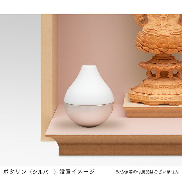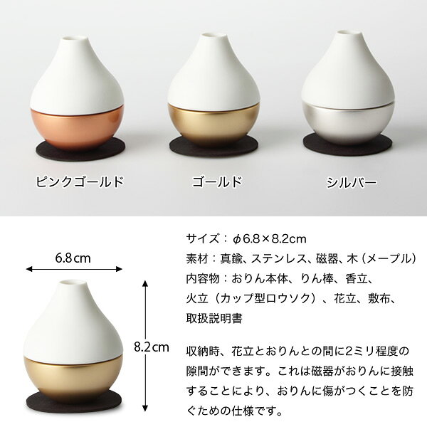 商品説明 コンパクトなオールインワン仏具 ポタリン3具足+おりんセット 全3色 素材 真鍮、ステンレス、磁器、木(メープル) カラー ゴールド・シルバー・ピンクゴールド サイズ φ6.8×8.2cm 内容物 おりん本体、りん棒、香立、火立(カップ型ロウソク)、花立、敷布、取扱説明書 コンパクトなオールインワン仏具 しずく型の本体の中に「三具足」(火立・香立・花立)がおさめられており、台の部分はそのままおりんとなるコンパクトなオールインワン仏具です。製造は金物の本場、富山県高岡市なので国産で安心です。 暮らしの近くに寄り添う 日常的には一輪差しとして普段の暮らしに溶けこみながら花を手向け、特別な時には本体内部より三具足を取り出し、そっと故人に手を合わせることができる。暮らしの近くに寄り添う小さな仏具です。 火立使用に関して 市販のカップ型ロウソク(Φ3.8×H1.8cm)をお使いください。 香立使用に関して 香立には短いサイズ(約7cm程度)のお線香をお使いください。 収納時、花立とおりんとの間に2ミリ程度の隙間ができます。これは磁器がおりんに接触することにより、おりんに傷がつくことを防ぐための仕様です。 火の点いたロウソクやお線香は、引き出した膳引きの上などお仏壇の外に置いてご使用ください。 暮らしに溶けこむコンパクトなオールインワン仏具 当方では、安心してお取引頂けます様に当方の過失等による場合の返品、お取替えには、十分対応しております。 ※表記の寸法と多少の誤差がある場合もございます。