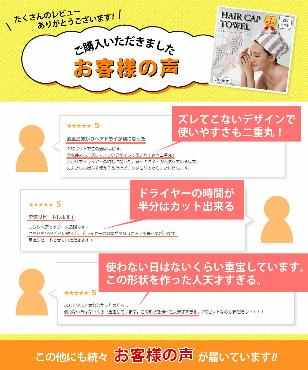 【ランキング1位獲得】タオルキャップ 2枚セット ヘアタオルキャップ ドライキャップ タオルドライ 吸水タオル タオルキャップ レディース ヘアターバン ヘアバンド マイクロファイバー お風呂上がり バス用品 ヘアタオル マイクロファイバーヘアキャップ 吸水性を格段にUPしたヘアータオルキャップ、あなたの大切な毎日の時間を短縮する魔法のアイテム 毎日使うものだから♪うれしい同色2枚セット。これで簡単にタオルドライが楽になる!巻いて吸水しておくだけで、髪を乾かす時間が大幅に短縮♪時短で簡単にタオルドライができるかわいい吸水ヘアキャップ♪簡単に着用できるので、空いた時間をスキンケアや自分磨きに♪ホテルなどでも使われる吸水性の高いマイクロファイバー素材を使用し、従来品よりマイクロファイバーの生地感と吸水性をUP!吸水性と肌触りを良くしたことで、着用感もGood♪あなたの髪の保護、湯冷めの防止、自分時間の確保に役立つこと間違いなしです♪※パープルが細めのストライプにリニューアルしております♪ 2