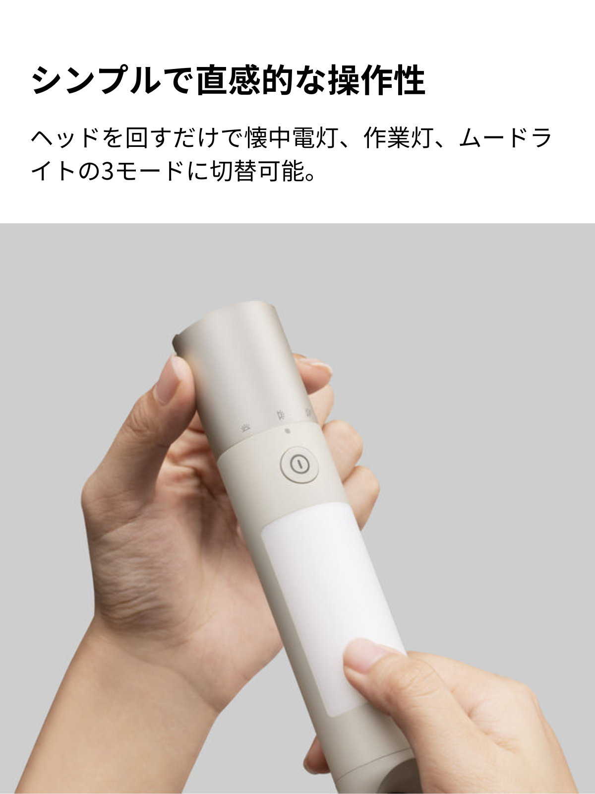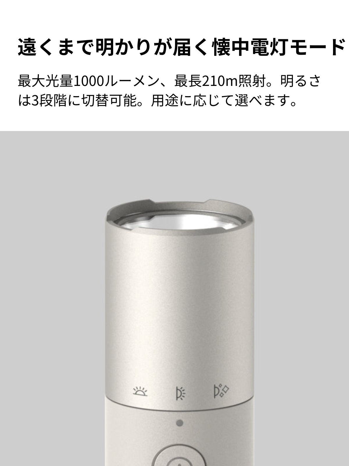 最大光量1000ルーメン / 多機能ライト / カラフルなムードライト / 用途を広げてくれるフック / 磁気マウント搭載 / 最大65時間駆動 / 3200mAhリチウムバッテリー内蔵 / Type-C 充電ポート 【 シンプルで直感的な操作性 】 モード切り替えヘッドを回すだけで、懐中電灯モード、作業灯モード、ムードライトモードを切り替えることができます。 【 遠くまで明かりが届く懐中電灯モード 】 最大光量1000ルーメンで最長210mまで照らすことができます。明るさは3段階で切り替え可能で、用途に合わせてお選びいただけます。 【 便利な磁気マウント 】 磁気マウントによって金属面にライトを取り付けて使うことができます。 【 空間を演出するムードライトモード 】 シンプルな暖色光のほか、ゆらぎのある暖色光、炎のようなゆらぎのあるキャンプファイヤー光、色が切り替わっていくカラフル光をシーンに合わせてお楽しみいただけます。 【 長時間駆動 】 3200mAhのリチウムバッテリーを内蔵しており、Type-C 充電ポートから繰り返し充電が可能です。満充電で最大65時間駆動を実現しています。 【 洗練されたデザイン 】 ライトの表面は真珠光沢スプレーで仕上げられており、高級感を演出しながら、ほどよいグリップ感と優れた耐摩耗性を実現しています。 【 活用シーンを広げてくれるマグネットバー 】 付属の滑り止めバンドと併用することで、テントのロッドなどに取り付けることも可能です。 【 伸縮可能なフック 】 フックは伸縮可能なので、テントや木の枝などにライトを吊るして使うことができます。フックの端と溝の部分はマグネット式になっており、しっかりと固定することが可能です。 キーワード: 誕生日プレゼント 男性 彼氏 父 クリスマスプレゼント 男性 父 彼氏 プレゼント 父の日