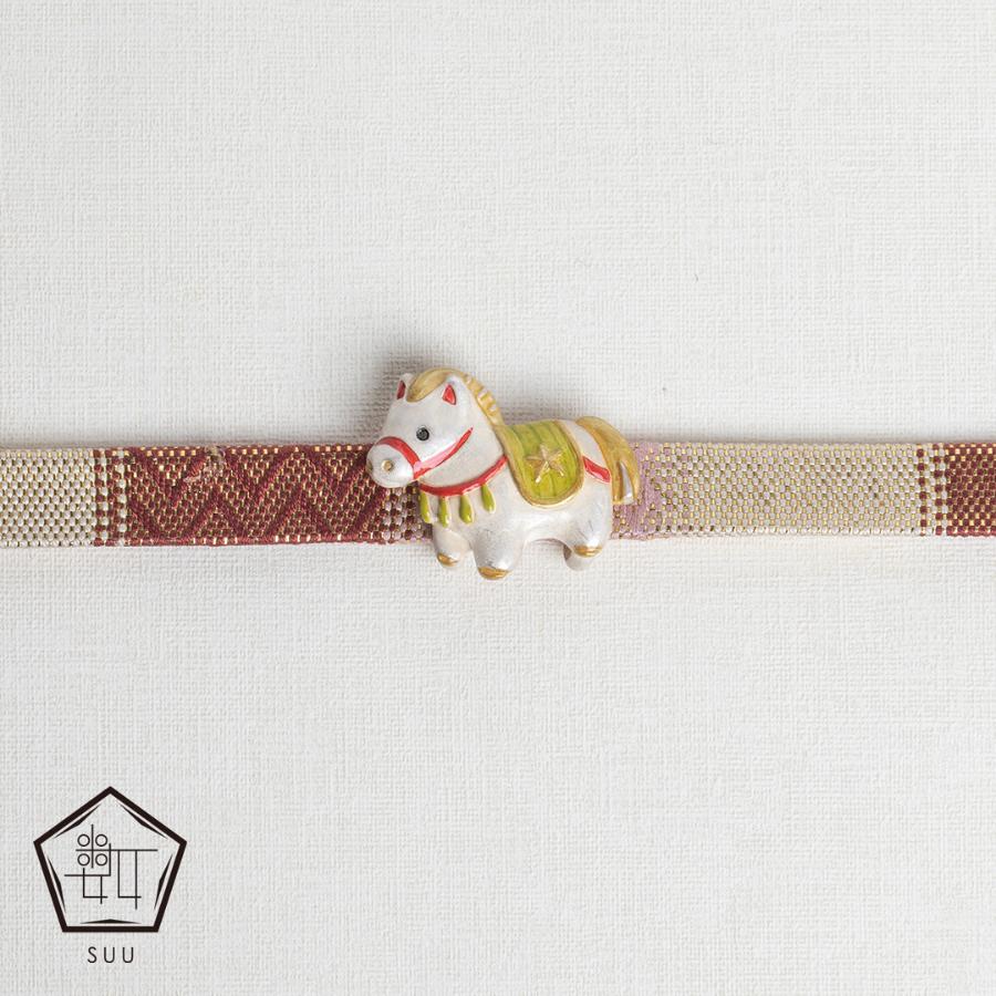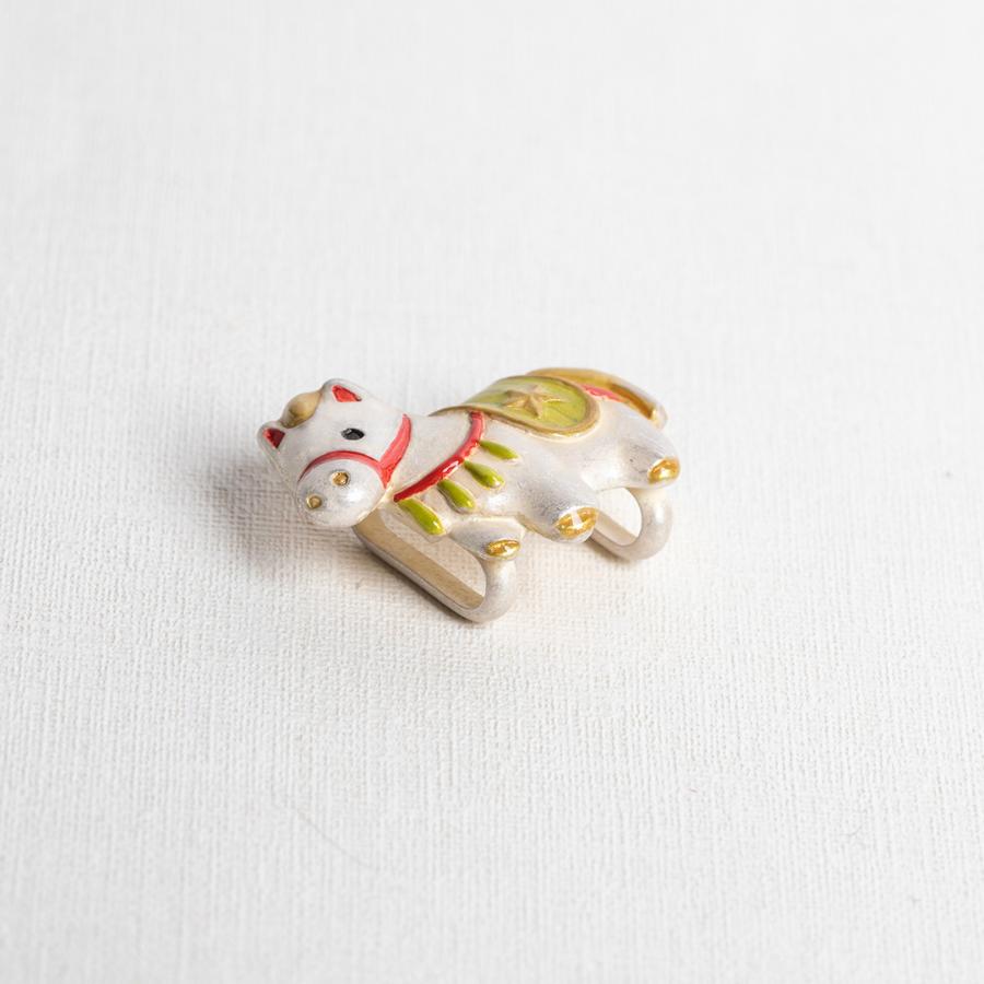 特徴ころんとしたフォルムが人気の干支張り子シリーズに、午(うま)の帯留めが仲間入り。 白い毛並みと青柳色(あおやぎいろ)の馬具が絶妙に調和し、優しく温かみのあるデザインに仕上がりました。 タンポポのような黄色いたてがみが可愛らしさを引き立てます。 馬モチーフは「物事が“うま”くいく」「幸運が駆け込んでくる」などといわれ縁起のよいアイテム。 贈り物としても最適な、心温まるアイテムです。モチーフサイズ縦約23mm×横約29mm素材ピューター生産国日本注意事項・三分紐という平たい帯向けの商品です。 ・帯締めは商品に含まれません。 ・こちらの商品はメーカーの職人によってハンドメイドで作られております。そのため、ひとつひとつの塗や表情が微妙に異なる繊細な作りとなっております。 手作りならではの温かみのある表情をお楽しみください。 ・着用後の返品は承りかねますので、ご了承ください。 ・他サイトでも販売しているため、ご用意できない場合がございます。
