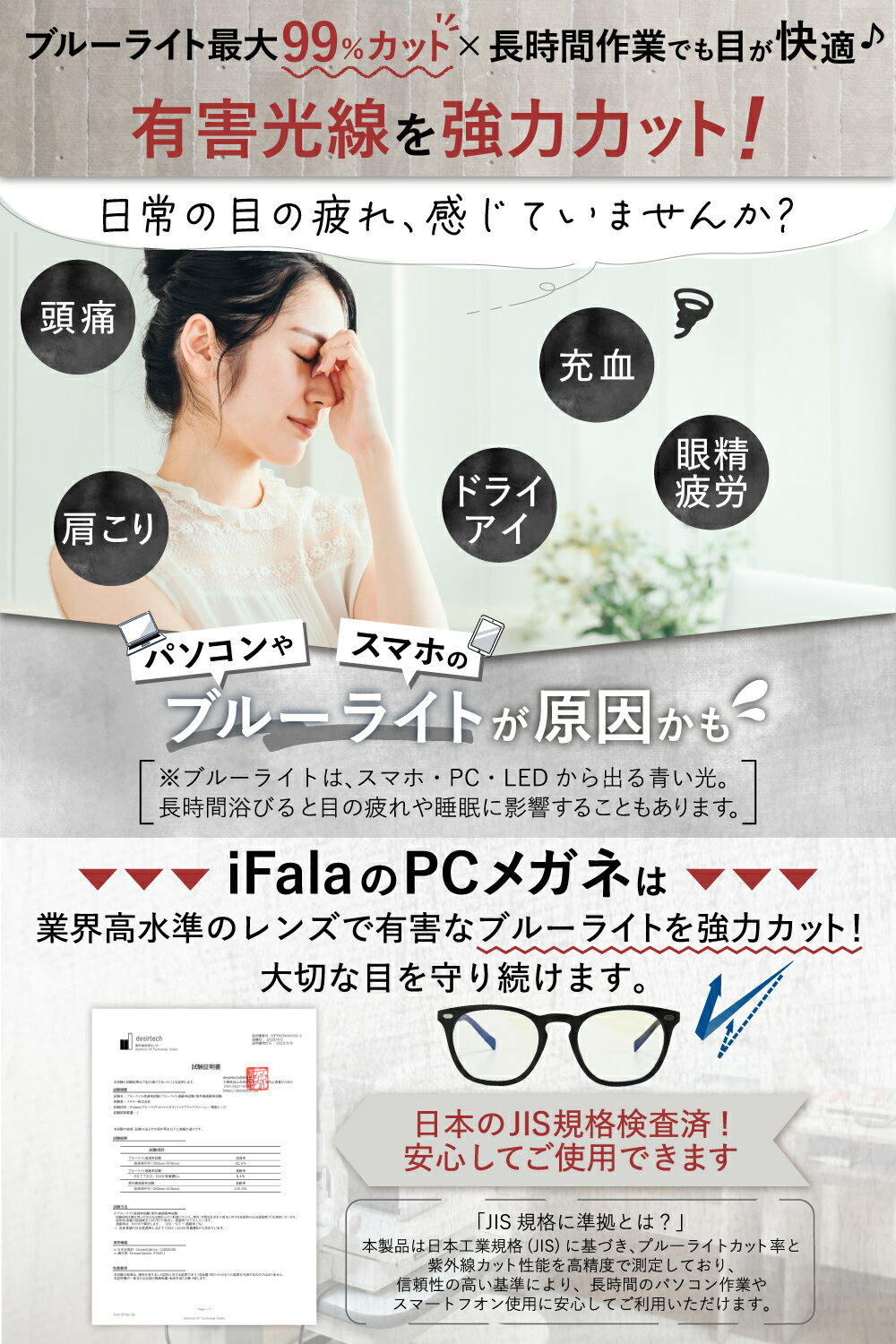【最新型調光レンズ搭載・3-in-1メガネ】ブルーライト最大99%カットでPC作業も目に優しく安心です。最新型調光レンズで紫外線もしっかりカット、サングラスや伊達メガネとしても使えるおしゃれで万能な次世代メガネ、仕事もプライベートもこれ一本でスタイリッシュに。(調光レンズは室内ではやや暗めになりますので、より明るいレンズをご希望の場合は、調光なしのレンズをお選びください。) 【JIS規格・国内検査機関試験済】UVカット(紫外線カット)率99%ブルーライトカット率最大99%(@380nm-500nm)ブルーライトカット率平均約40%(@380nm-500nm) 【日本人の顔に合うアジアンフィット設計・男女兼用】日本人の顔型にフィットする軽量フレームを採用。柔軟性のあるフレーム設計で、男性も女性も快適に使える度なしブルーカットメガネです。 【スタイリッシュで話題の伊達メガネ】医療用TR90×メタル合金フレームで軽量・柔軟・高級感を実現。わずか15gで快適、30度開くヒンジで圧迫感なし。2種類のフレームと3色以上から選べる、欧米基準を満たす高品質ブルーライトカット眼鏡。 【充実した付属品・お得な5点セット】充実のセット内容:1.サングラス本体 2.高品質な折りたたみケース 3.レザー収納ポーチ 4.メガネ拭き 5.取扱説明書【実店舗に負けないサービスを提供】自信があるからこそ、お客様に安心してお買い求めいただけます。初期不良はもちろん、「快適さを感じない」「イメージが違う」「サイズや質感が気に入らない」など、通常使用による破損も保証対象です。ぜひお気軽にお試しください。