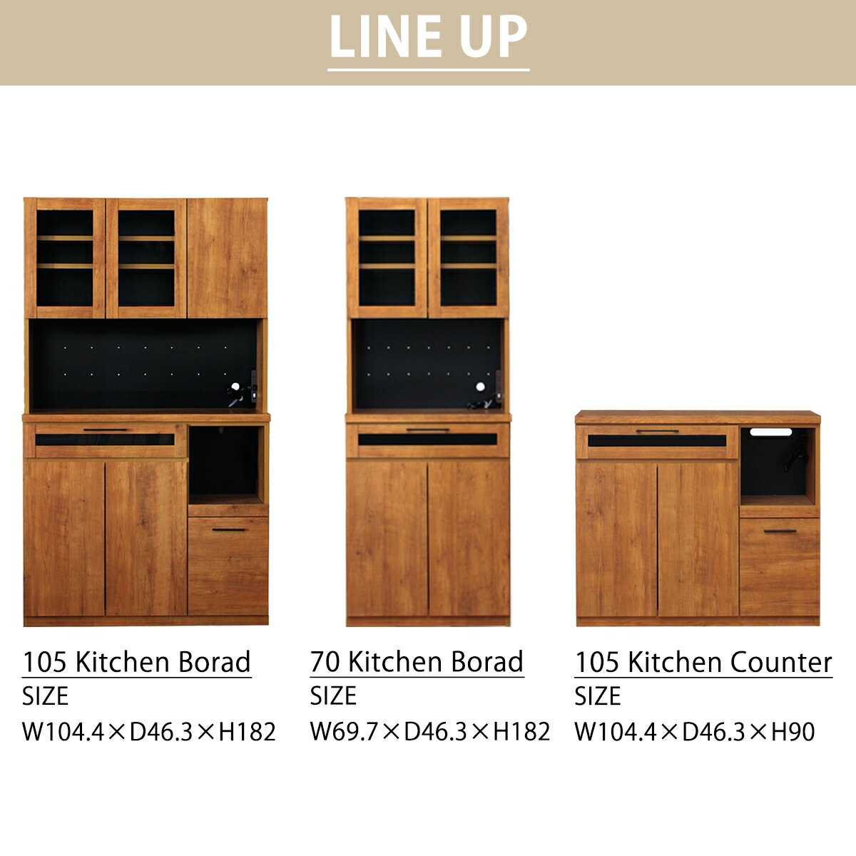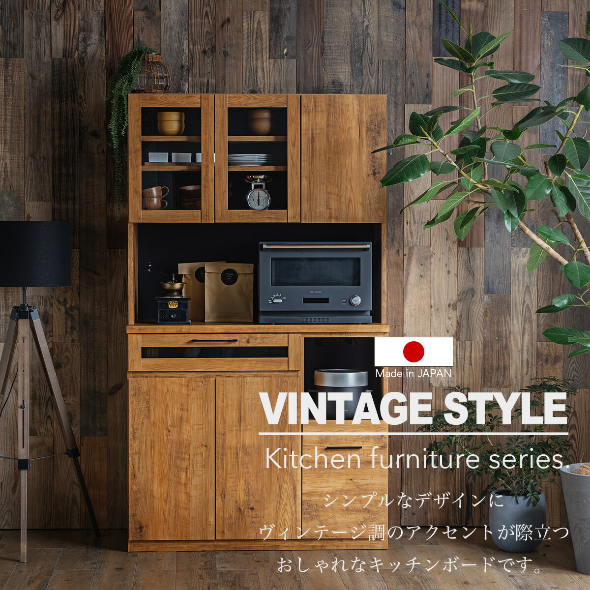 サイズ幅104.4×奥行46.3×高さ182cm ※詳細サイズは商品ページへ上げておりますのでご覧ください。素材/材質本体:プリント化粧板 ガラス:3mm透明ガラス 天板:ベニヤ 前板:強化紙化粧板 取っ手:スチール(粉体塗装)特徴長く使うものだから安心できるものを使いたい。そんな願いを叶える国産キッチンボードです。ヴィンテージ調の木目と黒スチールでオトナな雰囲気漂うデザインに。大容量の収納スペースを確保し、食器から家電までスッキリ収めることができます。注意事項■商品の撮影には最大限注意を払っておりますが、閲覧時のモニター環境によりましては実際の商品と若干違うお色味に映ることもございます。 ※色見本、生地見本、板見本等ご要望の場合は、お気軽にご連絡くださいませ。 ■こちらの商品は大型家具の為、ご希望の日時に配送できない場合がございます。 ■離島へのお届けの場合、別途送料が発生もしくはお届けが困難な場合がございます。ご注文の際は予めご相談下さいませ。 ■お届け予定日の2営業日前の配送日の変更、または当日ご不在の場合は再配送料として8,800円(税込)いただいております。必ず配送日のお知らせメールをご確認ください。送料送料無料+開梱・組み立て・設置サービス付き(梱包材の持ち帰りも全ておこないます。) ※東北・北海道・沖縄への配送は別途送料を頂いております。 北海道,沖縄:5,500円 東北:3,300円 ※離島へのお届けが必要な場合はあらかじめご相談ください。納期ご入金確認後、通常1〜2週間前後でお届けとなります。 ご注文商品が欠品の際はメールまたはお電話でご連絡いたします。配送について【重要】 商品の吊り上げが必要な場合の費用はお客様ご負担となります。 大型商品の場合は必ず購入前に搬入経路のご確認をお願いいたします。 ※搬入できない際の返品はお受けできません。並びに搬入ができない理由により商品を返却される場合は、往復運賃のご負担をいただきます。予めご了承ください。 ■お届け前に配送業者よりお届け時間の目安をご案内いたします。お届け先電話番号の登録はお間違えの無いようにお願いいたします。商品保証当店の商品には、保証書が付属しておりません。商品保証はメーカー保証にて商品到着より1年間となります。 ※一部商品を除く。 ご理解の程、宜しくお願い申し上げます。 ご不明な点等ございましたら、当店までご連絡の程よろしくお願い申し上げます。関連商品はこちら【開梱設置付き】キッチン収納 カウンタ...49,500円