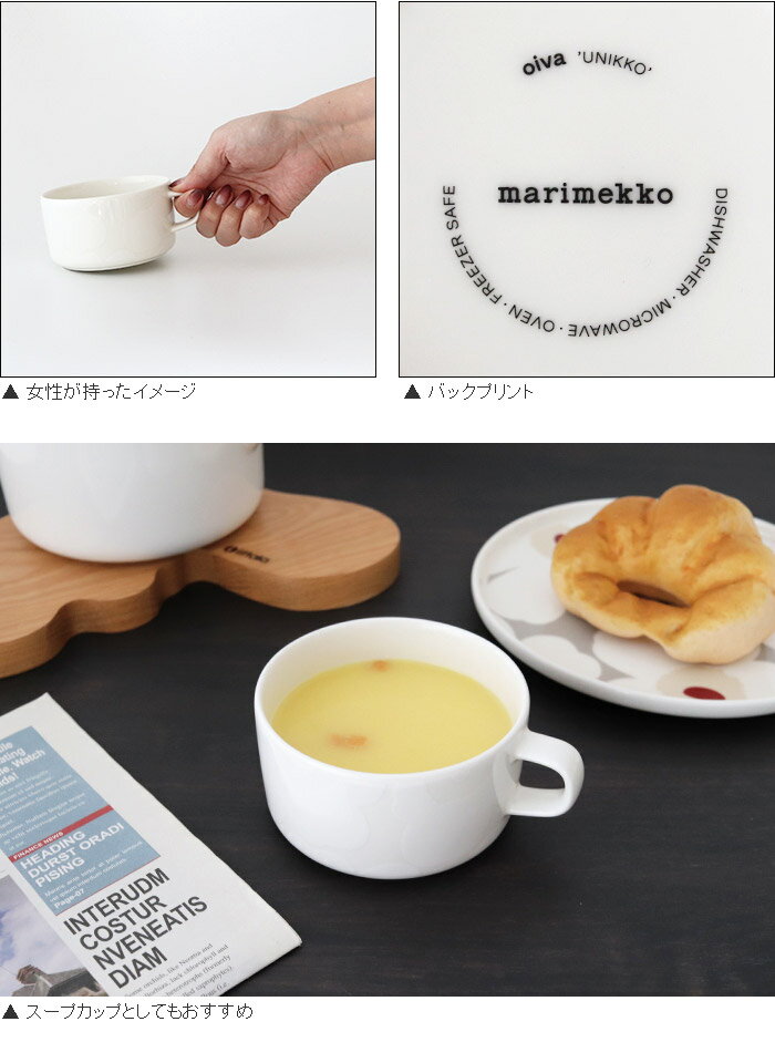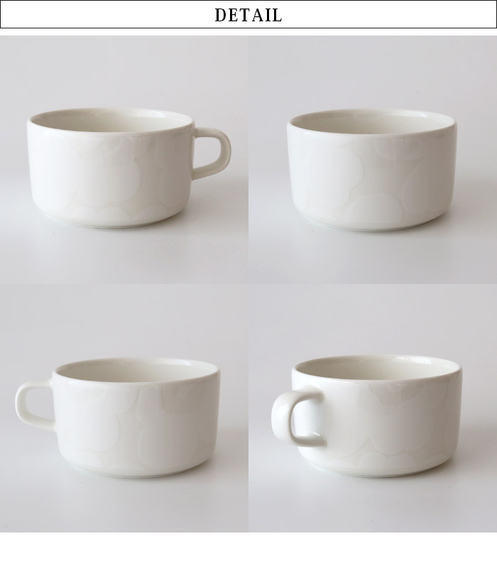 【製品仕様】 ■サイズ:約φ10×H5.5(cm) ■容量:約250ml ■素材: 磁器 ■原産国:タイ ■テキスタイル:Unikko(ウニッコ)/ケシの花 ■テキスタイルデザイナー:Maija Isola ■ブランド:marimekko(マリメッコ)/フィンランド ■食洗機、電子レンジ、オーブン、冷凍庫:可 ▲ウニッコ柄アイテムはこちらから ■コメント: マリメッコを代表するテキスタイル「UNIKKO(ウニッコ)」。一見、シンプルな白い無地の食器に見えますが、ホワイト×ホワイトでウニッコがデザインされていてます。 「ティーカップ」としてはもちろん、スープカップやデザートカップとしてもオススメです。深さが浅いので、スープなどをすくいやすいのも魅力。毎日のテーブル・ティータイムが楽しくなるアイテムです。 ■関連カテゴリー: ▲マリメッコ マグはこちらから ▲マリメッコ キッチンアイテムを全て見る ▲マリメッコを全て見る ▲美味しにもこだわったノンカフェインコーヒーマリメッコを代表するテキスタイル「UNIKKO(ウニッコ)」。一見、シンプルな白い無地の食器に見えますが、ホワイト×ホワイトでウニッコがデザインされていてます。 「ティーカップ」としてはもちろん、スープカップやデザートカップとしてもオススメです。深さが浅いので、スープなどをすくいやすいのも魅力。毎日のテーブル・ティータイムが楽しくなるアイテムです。 ▲ウニッコ柄アイテムはこちらから ▲マリメッコ マグはこちらから ▲マリメッコ キッチンアイテムを全て見る ▲マリメッコを全て見る ▲キッチンアイテムを全て見る ▲北欧で愛され続けるスティグ・リンドベリ ▲美味しにもこだわったノンカフェインコーヒー ▲おしゃれなデザインシュガーはおもてなし&ギフトにも!