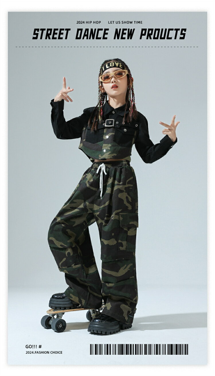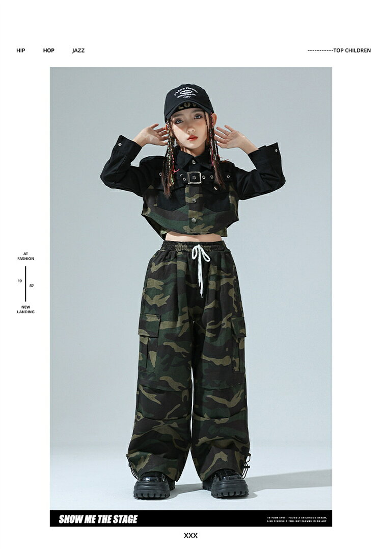 迷彩 セットアップ キッズ ダンス 衣装 ヒップホップ 迷彩柄 カーキグリーン ジャケット カーゴパンツ クロップドジャケット カモフラージュ パターン 女の子 hiphop jazz ジャズ 韓国 韓国風 K-POP 子供服 ストリート ステージ衣装 チアリーダー 110-180cm