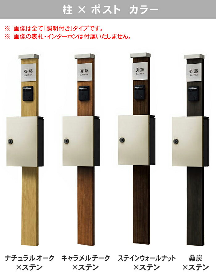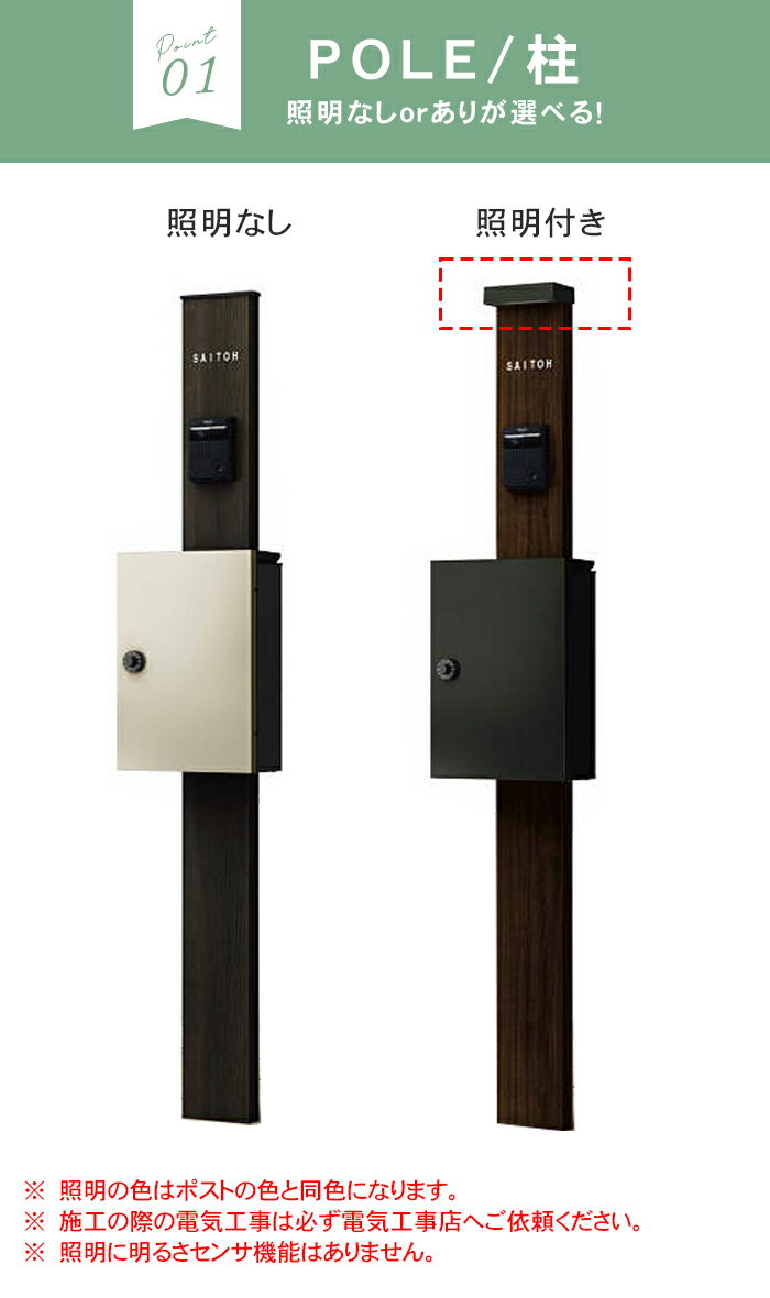 YKKAP 機能門柱 ルシアス ポストユニット HD03型 ポストT13型セット シンプルで住宅外観に馴染みやすい木目調のポストユニット。 セット内容 ・スタンド柱本体・エクステリアポストT13型・ポスト取付部品・ネームシール・照明あり/なしは選択可能 ※インターホン、照明の接続ケーブルは付属致しません。 ※照明の配線工事は電気工事士の資格が必要です。電気工事店へ依頼下さい。 オプション品【エクステリアポストT13型用ダイヤル錠 (2桁タイプ)】はこちら 商品名 YKKAP 機能門柱 ルシアス ポストユニット HD03型 ポストT13型セット 商品説明 シンプルで住宅外観に馴染みやすい木目調のポストユニット。 ポイント ●照明なしor照明ありが選べます。 ●ネームシールが付属しております。 ●ポストは上入れ/前取り出し仕様です。 ●ポストはダイヤル錠が標準装備です。 サイズ ポール:幅約150×奥行約40×高さ約1600mm ポスト:幅約300×奥行約120×高さ約420mm ※詳細は商品ページ内の寸法図にてご確認下さい。