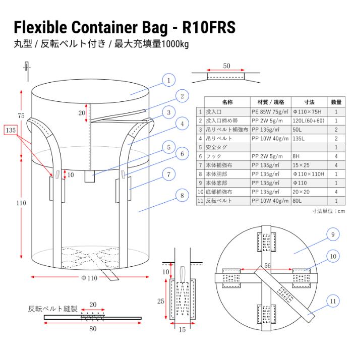 フレコンバッグ 1t 1m3 丸型 1100×1100 10枚入 反転ベルト付 UVカット