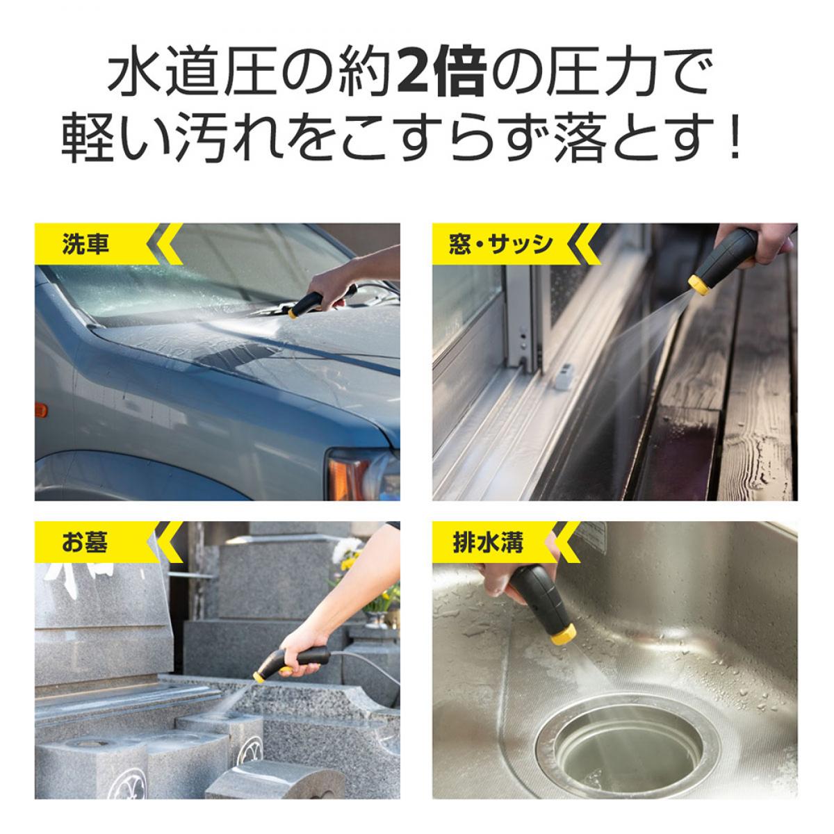 こちらの商品は、直接外箱に送り状を貼り付け発送させていただきます。 (ダンボールなどは使用しない点、予めご了承ください) コンパクトで持ち運び可能なコードレスの洗浄機。給水タンク一体型なので、電源や水源を気にせずどこでも使用でき、水道の約 2 倍圧の細かい扇状の水流で少ない量でも効率的に洗浄します。 <面倒なセッティング準備不要> ウォータータンク・充電式バッテリー内蔵。最大 8L のたっぷりの水で洗浄でき、 AC だけでなく USB でどこでも充電可能。思い立ったらすぐに使える洗浄機です。 <コンパクト収納> 保管時や移動に便利な折りたたみ式です。 <40 °Cまでのお湯が使用可能> 柔らかくして汚れを落としやすくするお湯も使用でき、ビーチや緊急時の簡易シャワーとしても便利です。 <外出先だけでなく室内でも大活躍> アウトドアやビーチ、ペットやお墓掃除などの屋外はもちろん、家周りの窓や網戸、ベランダやキッチンの排水溝、浴室やエアコンのフィルターなど、今まではこすって落としていた、泥や花粉、ほこりやヌメリ汚れなどの洗浄に最適。 《製品仕様》 ●吐出圧力 低圧 ●吐出水量 (l/min) 最大 2 ●バッテリータイプ リチウムイオンバッテリー ●バッテリー稼働時間 (分) 最大 15 ●バッテリー充電時間 (h) 2.25 ●質量(アクセサリーを含まない)(kg) 2.2 ●梱包質量(kg) 3.1 ●寸法(長さ×幅×高さ)(mm) 305 x 298 x 271 ●付属品・同梱品 充電器: 充電 USB ケーブル(タイプ C ) + 充電アダプター(各 1pc. ) リチウムイオンバッテリー フラットジェットノズル ●製品機能 給水タンク容量: 8 L ホース長さ: 1.8 m ホースタイプ: 低圧フレキシブルホース 給水口フィルター(本体内部取り付け済) 圧力トリガーガン: 低圧トリガーガン 【ご購入前にご確認ください】※沖縄・離島、その他一部地域からのご注文はお受けできません。システムの都合上ご注文は可能ですが、自動キャンセルになりますのでご了承ください。※当店ではのし・ラッピング梱包は承っておりません。※お客様都合でのキャンセル及び返品・交換は受け付けておりません。あらかじめご了承の上、ご注文ください。※商品の仕様・パッケージや原産国・原産地などは、メーカーの都合により予告なく変更される場合がございます。最新の情報につきましては、メーカーにご確認くださいますようお願いいたします。