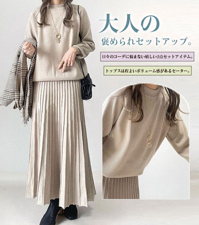 「★全商品クーポン付き」ニット 秋冬 セットアップ スカートセット レディース ビッグカラー Aライン 2点セット 長袖 プリーツスカート スカートスーツ 無地 セーター ニットセットアップ ロングスカート ゆったり 大人可愛い お呼ばれ