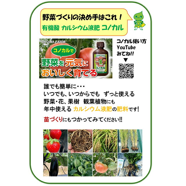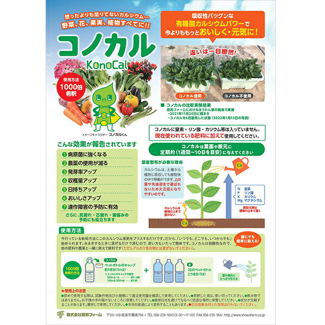 カルシウム液肥 コノカル このカルシウム液肥を加えるだけで!! 花も野菜も元気で長持ち! 野菜・果物がおいしくなる! 農薬が最小限で済む! 【商品特長】 ●コノカルは、植物に吸収されやすい水溶性カルシウムです。 ●このカルシウム液肥は酸性なので、他の肥料や農薬と一緒に使えて便利です。 ※ただし、アルカリ性の物とは混ぜないでください。 ●細胞分裂・・・発育促進、根張りはよくなる、花数が増える(収穫量が増える) ●細胞壁・・・・強くなる ●免疫力・・・・病原菌に強くなる ●食味値・・・・味がよくなる 【使用方法】 ●1000倍希釈 ●かん水・土壌改善改良:10aあたり3kgを週1回、もしくは月に2~3回程度 ●葉面散布(葉の表面にまんべんなく散布してください) ●農薬・液肥との混用はできますが、アルカリ性の農薬・肥料との混用はできません。 (本剤を1000~2000倍に希釈してから、農薬・他の液肥を希釈して使用してください) 【成分】 ●カルシウム・・・1.2% ●窒素・リン酸・加里全量・・・0.5%未満 ※生産した事業場における平均的な測定値であり、保証するものではありません。