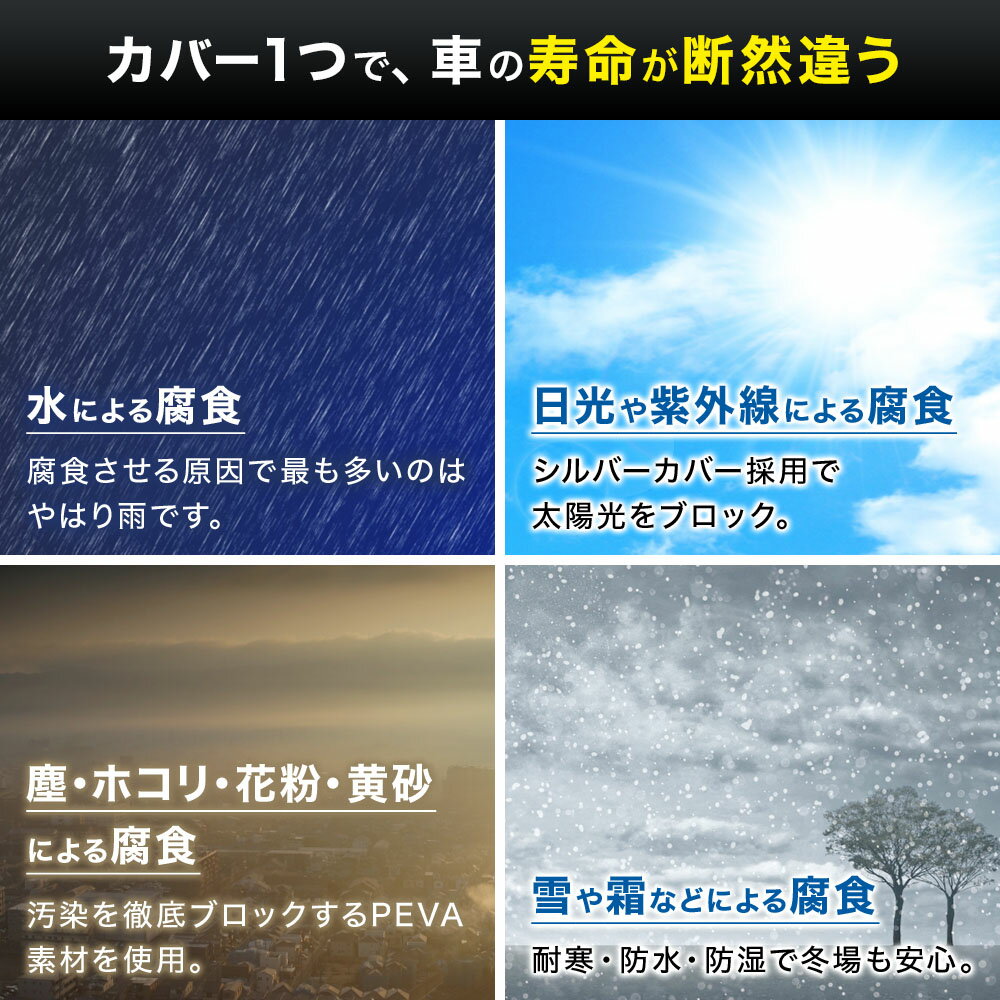よく一緒に購入されている商品\最大2000円OFFクーポン有★1/1〜6迄1,180円\2点500円OFFクーポン有★29日〜/ 車1,780円 簡単設置&収納!大切な車を守る長寿命カーカバー 3層構造でボディを優しく包み込みます。 特にボディに触れる内側には、やわらかな綿生地を採用しており、 愛車を傷つけずにしっかりと保護します。 また、カバーの裾には強力な太いゴムが使われており、 付属の布製ロープでしっかり固定できるため、強風の日でも安心です。 使用後は、付属の収納袋に簡単に収納でき、保管もラクラクです。 【機能・ポイント】 ・防水・通気性:空気は通しつつ、雨をしっかり弾く防水設計です。 ・紫外線カット:夏の強い日差しや紫外線からボディを保護します。 ・ほこり・花粉ガード:PM2.5や黄砂から車体を守り、車内の空調機能も長持ちさせます。 ・雪・霜対策:冬の積雪や霜からボディを保護し、サビや腐食を防ぎます。 ・木の葉や鳥のフンからガード:ガレージ外でも、落ち葉や鳥のフンから車を守ります。 【3層構造のこだわり】 1層目::アルミフィルムで熱や紫外線をしっかりブロック。 2層目::軽くて柔らかなEVA素材で、強度と弾力性を両立。 3層目::優しい触り心地の綿生地が、ボディに直接触れる部分をやさしく保護。 ■ 【便利で長持ち】 ファスナー付きデザイン。 カバーを装着したままでも、ファスナーを開けて 簡単に車内の確認や荷物の出し入れが可能です。 ■ 【反射材で安全性アップ】 ミラーや前後部分に計6箇所の反射材を装備。 暗い場所や照明のない場所でもカバーが目立ち、安全性を確保します。 ■ 【布製&ゴム製のベルトでしっかり固定】 車体を傷つけにくい布製ベルトと、伸縮性のあるゴム製ベルトで カバーをしっかり固定。車を傷つけずに強風にも強い構造です。 <注意事項> ※ご購入前にお車のサイズをご確認ください。 ※輸送や保管により、細かな傷がある場合がございますが、品質には問題ありません。 ※車の登録から10年以上経過している場合、塗装の劣化が進んでいることがあり、 濡れた状態でのカバー使用によりシミが発生することがあります。 異常が見られた際は、すぐに使用を中止してください。 【商品詳細】 ◆軽用 適応車体サイズ目安: (約)長さ4.8×横幅1.7×高さ1.75m ※ご購入前にお車のサイズをご確認ください。 材質: 1層目/アルミフィルム、2層目/EVA、3層目/綿生地 重量: 約2.7kg ◆SUV用 適応車体サイズ目安: (約)長さ4.9×横幅1.85×高さ1.8m ※ご購入前にお車のサイズをご確認ください。 材質: 1層目/アルミフィルム、2層目/EVA、3層目/綿生地 重量: 約2.8kg ◆ミニバン用 適応車体サイズ目安: (約)長さ5.35×横幅1.85×高さ1.9m ※ご購入前にお車のサイズをご確認ください。 材質: 1層目/アルミフィルム、2層目/EVA、3層目/綿生地 重量: 約3.3kg 【関連ワード】 紫外線カット 防サビ 新着商品はこちら2025/12/29カップウォーマー USB コーヒーウォーマー 1,280円2025/12/29キーホルダー ディスプレイ スタンド ストラッ1,980円~2025/12/272026福袋 NIIMBOT ミニプリンター 3,980円~再販商品はこちら2025/12/29\2点500円OFFクーポン有★29日〜/ ツ6,980円2025/12/29\最大2000円OFFクーポン有★1/1〜6迄17,600円2025/12/29\2点500円OFFクーポン有★29日〜/ タ1,580円~2025/12/29 更新類似商品はこちら\最大2000円OFFクーポン有★1/1〜6迄1,980円\2点500円OFFクーポン有★29日〜/ シ2,190円\2点500円OFFクーポン有★29日〜/ 車2,190円~\最大2000円OFFクーポン有★1/1〜6迄2,500円
