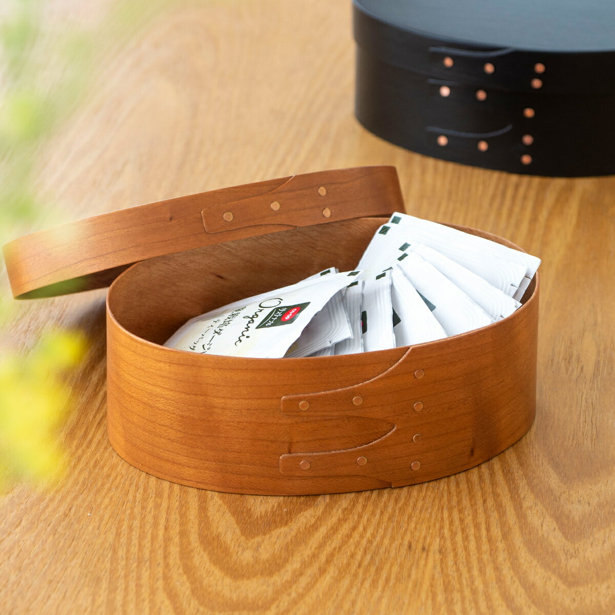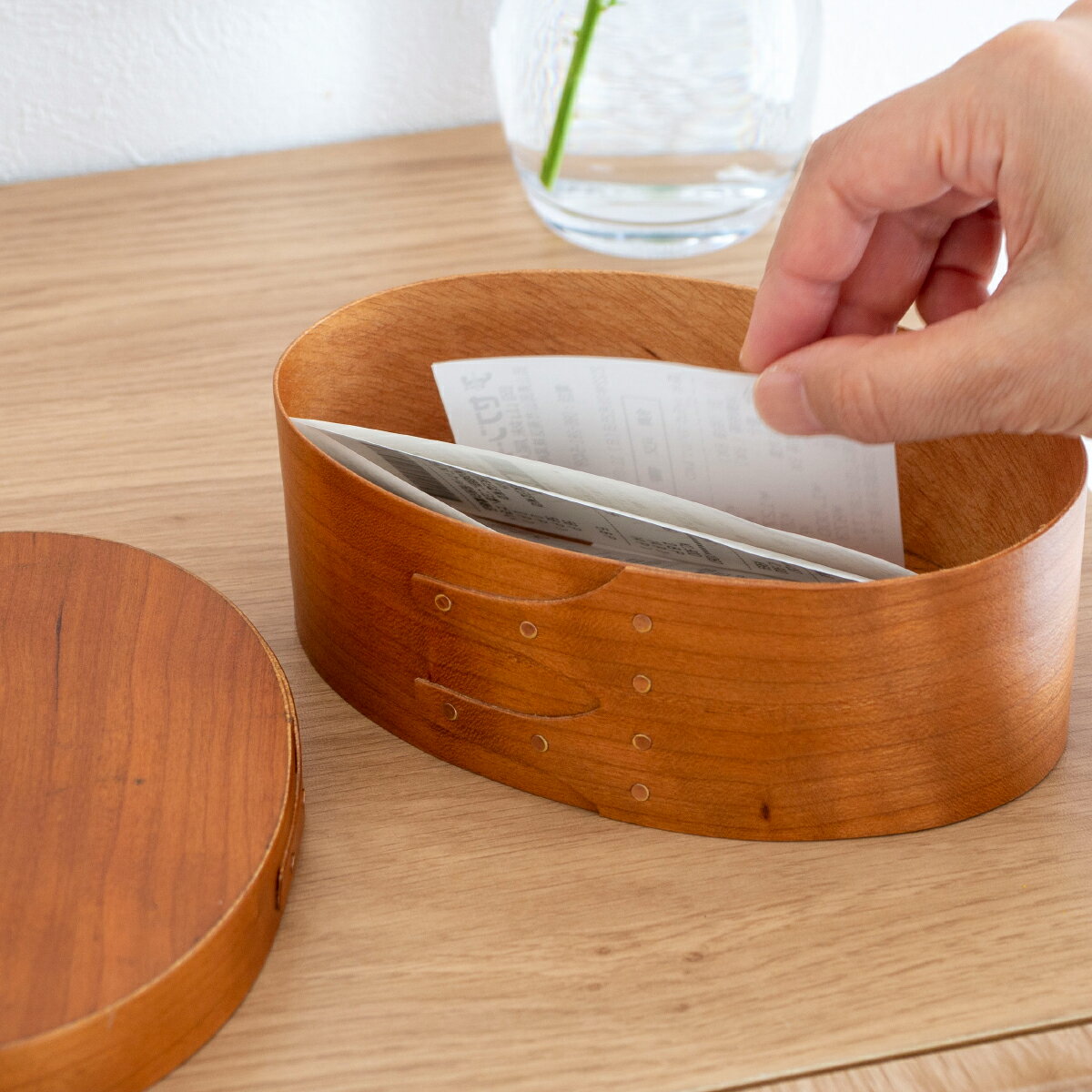 特長 シェーカーの道具にヒントを得て作った、一番小さいSSサイズのオーバルボックスです。 オーバルボックスSSは、両手に乗るぐらいのサイズ感で、カウンターや家具の上などちょっとしたスペースにも飾っておく事ができます。日常の細々とした身の周り品や薬などをしまって、飾りながら収納できるアイテムです。 オーバルボックスはSS・S・M・Lの4サイズ展開です。入れ子状にして収納が可能なので、普段はまとめてしまっておき、必要になったら出す事ができるので、使わない時も場所を取りません。 アクシスのシェーカーボックスは、シェーカーボックスのシンプルな美しさはそのままに、現代の日本の生活でも使いやすいサイズや機能性にこだわり全て手作業で作られています。 素材のチェリー材は軽く、整っているけれど素朴な木肌をしていて、長く使っていくうちにこっくりとした色合いに変化していきます。使い込むほどに愛着が湧いてくるアイテムです。 【シェーカーボックスとは】19世紀にアメリカのシェーカー教徒によってつくられた木製品のひとつ。薄い曲げ木や、スワロウテイルと呼ばれる端のカット、小さな金属製の鋲などが特徴的なデザインです。 仕様 サイズ:約W16.2×D11.0×H6.0cm 素材:チェリー材 生産国:台湾 attention こちらの商品は全て天然の木材を使用して手作りで制作をしておりますため、木目の出方や色合い、仕上げ等に若干の個体差がございます。予めご了承下さい。AXCIS/Homestead シェーカーオーバルボックス SS 絵になる美しい佇まい。 大切に使いたい、木製収納ボックス。 シェーカーの道具にヒントを得て、 ハンドメイドで丁寧に作られた 一番小さいSSサイズのオーバル型収納ボックス。 蓋付きだから、生活感を隠しつつ、おしゃれに収納できます。 収納アイテムにはもちろん、 何を入れても様になるおしゃれなデザインは、 インテリアのアクセントにもなりますよ。 ・ブラック SSサイズ 商品ページはこちら >> どこに置いても絵になる美しい佇まいに思わずうっとり。 暮らしを豊かにしてくれるアイテムです。 用途に合わせて選べる4サイズ。 オーバルボックスはSS・S・M・Lの4サイズ展開です。 入れ子状にして収納が可能なので、 普段はまとめてしまっておき、 必要になったら出す事ができるので、 使わない時も場所を取りません。 ・Sサイズ 商品ページはこちら >> ・Mサイズ 商品ページはこちら >> ・Lサイズ 商品ページはこちら >> 形違いのラウンドタイプもあります。 ラウンドボックスはSS・S・Mの3サイズ展開。 好みに合わせてお選びください。 ・ラウンドボックス一覧はこちら >> アイデア次第で自由に使える。 シンプルなデザインと実用性を兼ね備えたシェーカーボックス。 オーバルボックスSSは、両手に乗るぐらいのサイズ感で、 カウンターや家具の上など ちょっとしたスペースにも飾っておく事ができます。 日常の細々とした身の周り品や薬などをしまって、 飾りながら収納できるアイテムです。 蓋は、ひっくり返してトレー代わりにお使いいただけますよ。 ライフスタイルに合わせてお気に入りのものを収納してくださいね。 シェーカーボックスの魅力。 シェーカーボックスは、 19世紀にアメリカのシェーカー教徒によって つくられた木製品のひとつです。 楕円形のフォルムと、曲げ木の風合い。 木材を留めるツバメの尾のような仕立てと、真鍮のリベット。 手作業により薄い木材を曲げて作られるボックスは、 ミニマルな機能性と素朴な佇まいが時代を超えた魅力を持っています。 アクシスのシェーカーボックスは、 シェーカーボックスのシンプルな美しさはそのままに、 現代の日本の生活でも使いやすいサイズや 機能性にこだわり全て手作業で作られています。 素材のチェリー材は軽く、 整っているけれど素朴な木肌をしていて、 長く使っていくうちにこっくりとした色合いに変化していきます。 使い込むほどに愛着が湧いていきますよ。 ・SSサイズ(現在の商品ページはこちら) ・Sサイズ >> ・Mサイズ >> ・Lサイズ >>