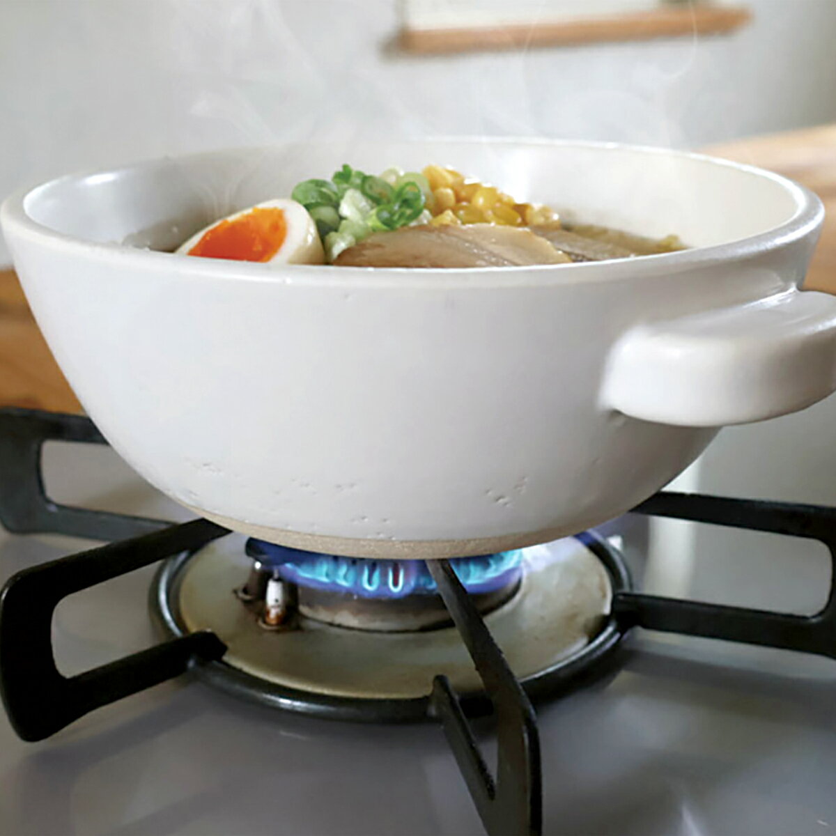 特長 萬古焼のブランド「かもしか道具店」の陶器製「直火のラーメン鍋」です。直火にかけられるので、コンロで調理してそのまま器として食卓でアツアツのラーメンが食べられます。 インスタントラーメンのスープの容量は500mlが平均なので、具材をのせてちょうどよい見栄えになります。 鍋焼きうどんや湯豆腐、1人用のお鍋としても使えるほか、盛り鉢として普段使いもできます。 仕様 サイズ:約直径18×W21×H7cm 容量:約1000ml(満水時) 素材:耐熱陶器 原産国:日本 attention 電子レンジ・オーブン・直火対応。 IHはご使用いただけません。 食洗機での洗浄が可能です。 底がぬれたまま火にかけると破損の原因になりますので、水気をよく拭きとってから火にかけてください。 熱い状態の本体を急激に冷やしたり、タイルやステンレス台などの冷たい場所に直接置かないでください。 加熱中および加熱後は、高温のため危険ですので、必ずふきんや鍋つかみなどを使用してください。 空焚きはおさけください。 陶器製ですので、落としたり衝撃を与えたりしますと破損する恐れがありますのでご注意ください。 揚げ物料理には使用しないでください。 金属たわしや研磨入りの洗剤をお使いになると表面に傷をつける恐れがありますのでご注意ください。 原材料の土や釉薬の特性により製品の大きさ、形状、色、質感、重量に若干の違いが生じます。 ご覧いただく環境によって色の見え方などが実物と異なる場合がございます。 【お手入れ方法】 お手入れは食器専用洗剤を使用し、十分に水洗いしてください。 洗う際は柔らかいスポンジを使用して洗ってください。 使用後はしっかりと洗浄し、乾燥させてから収納してください。かもしか道具店 直火のラーメン鍋 コンロで調理してそのまま食卓へ。 アツアツが食べられるラーメン専用鉢。 萬古焼のブランド「かもしか道具店」の 陶器製「直火のラーメン鍋」です。 お鍋と器が一体化したうれしい商品。 直火で調理したあと、そのまま食卓へサーブして アツアツのまま食べられます。 いつものインスタントラーメンが ご馳走ラーメンに! 体も心も満たしてくれますよ。 ちょっと軽めに済ませたい時や お子様のお夜食など、 ラーメンだけでなく、鍋焼きうどんや1人用鍋もOK。 煮物やサラダなどの盛り鉢としても お使いいただけます。 具材をたっぷり乗せられる。 満水時は約1000mlと大容量。 インスタントラーメンのスープの容量は 500mlが平均なので、 具材をのせてちょうどよい見栄えになります。 たっぷり食べたい方にうれしい 大盛り調理もできますよ。 冷めても直火やレンジで温め直しができるのも うれしいポイントです。 食器としても使える。 おかずの盛り鉢やサラダボウルとして使ってもOK。 汁気たっぷりの煮物にも気にせず使えます。 シンプルで素朴なデザイン。 シンプルなデザインと 味わいのあるマットな風合いが魅力の器です。 カラーは、白と黒のモノトーンカラーをご用意しました。 両側の取っ手は指が引っ掛けやすいように 裏面にくぼみがつけてあり、 布巾や鍋つかみでも持ちやすくなっています。 同じデザインのれんげもあります。 ひのきの敷板(小)も合わせて使うと便利ですよ。 ・れんげはこちら>> ・ひのきの敷板(小)はこちら>> かもしか道具店のお話 たのしく、しっかりとした 生活文化を発信し、 食卓を通じ幸せを届けたい。 「かもしか道具店」は 三重県菰野町にある萬古焼の窯元、 山口陶器が立ち上げた産地ブランドです。 三重県の県獣と菰野町の町獣が ともにカモシカというところから 名付けられました。 “萬古焼産地を残す”という 熱い想いで作る道具達は デザインがスッキリと美しく、 高い機能性を兼ね備えています。
