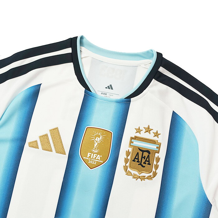 史上初の3か国による共同開催となる FIFAワールドカップ2026 で着用予定。 アルゼンチン代表 2026 ホーム ユニフォーム。 リオネル・メッシのオフィシャルネーム&ナンバー入りモデル。 ■商品仕様 ・レプリカユニフォーム(13,200円[税込])にオフィシャルマーク(7,150円[税込])を圧着した商品です。 ・アルゼンチン 26 ホーム レプリカ ユニフォームは単なるユニフォームではない。アルゼンチンのサッカーのレガシーを称えるものだ。このキットは、アルゼンチンが1978年、1986年、2022年のワールドカップで3度の優勝を達成した時に着用していたユニフォームにインスパイアされており、協会の創立年を誇らしくあしらっている。 ・涼しく、ドライな着心地が続くから、いつでもプレーの準備は万端。クライマクールは汗を吸収して分散させ、涼しくドライで集中できるパフォーマンスをサポート。ダブルニット生地は、チームを応援するときも、自分自身がピッチに出るときも、快適なフィット感を提供。 ・スリムフィットと大胆なスリーストライプスが特徴のこのジャージーは、情熱をはっきりと表現したい人のためのデザイン。刺しゅうされたadidasロゴとエンブレムがオーセンティックさを添える、アルゼンチンのファンには欠かせないアイテム。 ・胸中央にはFIFAワールド杯2022優勝パッチ(ラバープリント)。 ・胸の協会エンブレム上の★★★は3度のW杯優勝の証(刺繍)。 ・協会エンブレムは織りワッペン縫い付け。メーカーロゴは刺繍。 ■メーカーサイズ ・S:身長162-168cm、胸囲85-88cm、胴囲71-74cm ・M(インポートS):身長167-173cm、胸囲89-92cm、胴囲75-78cm ・L:身長172-179cm、胸囲93-96cm、胴囲79-82cm ・XL(インポートM):身長177-183cm、胸囲97-100cm、胴囲83-86cm ・2XL(インポートL):身長182-188cm、胸囲101-106cm、胴囲87-93cm ・3XL:身長187-193cm、胸囲107-112cm、胴囲94-100cm ・4XL(インポートXL):身長192-198cm、胸囲108-113cm、胴囲95-101cm ■素材:ポリエステル100%(リサイクル素材) ※今後、番号やネーム表記が変更になった場合の交換や返品は不可となります。予めご了承願います。 ※マーク圧着した商品の返品・交換、および代引きでのお支払いは不可となります。 ※モニターの発色具合によって実際の色と異なる場合があります。