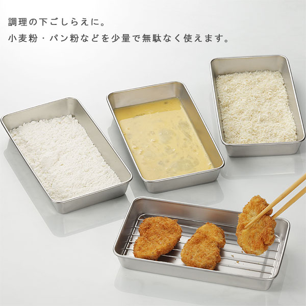 とんかつ1枚が丁度よいスリムサイズのバットで、小麦粉・パン粉などを少量で無駄なく使えます。並べて使っても場所をとらず、スペースを有効活用できます。冷蔵庫内でも収まりのよい角型。別売りのスリムバット用アミとセットで使えます。 サイズ:横幅12.7×奥行22.2×高さ3.3cm 容量:0.96L 素材:18-8ステンレス 備考:食洗機可 日本製 ※当店は「家事問屋」オンラインショップ認定店となります。「ありきたり、なのに使いやすい。」 ずっと使いたくなるものを、ずっとつくり続ける。 見た目や機能はとってもシンプル。でも気づけば手放せない存在になっている。 そんな道具を生み出す家事問屋の、スリムバットです。 とんかつ1枚が丁度よいスリムサイズのバットで、小麦粉・パン粉などを少量で無駄なく使えます。 並べて使っても場所をとらず、スペースを有効活用できます。 冷蔵庫内でも収まりのよい角型。 別売りのスリムバット用アミとセットで使えます。 18‐8ステンレスはサビにくく、お手入れが簡単な金属です。 無駄をそぎ落としたシンプルなルックスが魅力。 食洗機の使用が可能です。 調理の下ごしらえにとっても便利なスリムバット! 揚げ物の下ごしらえにも便利な浅型です。 とんかつ1枚がぴったりのサイズで、小麦粉やパン粉、卵が少量で無駄なく使えます。 狭いスペースにもすっきり並べられるので、複数個のご使用もおすすめ。 重ねてコンパクトに収納できます。 カットした野菜の一時置きや、マリネ液の漬け込み、魚や肉の下準備など、幅広い用途で使えるバットです。 別売りのアミとセットで使えば、揚げ物の油切りになります。 アミは脚付きでカラッと油切りができます。 使いやすいから、つい手に取りたくなる。面倒に感じなくなる。 毎日のひと手間を助ける、家事問屋の道具です。 取り扱い上の注意 ・初めてご使用の際は、食器用洗剤をつけたスポンジでよく洗ってからご使用ください。 ・ご使用後は汚れを落とし、早めに水気を拭き取ってから保管してください。 ・火にかけたり、火のそばで使用しないでください。火傷や製品の変色の原因になります。 ・18‐8ステンレスはサビにくい金属ですが、水気や塩分の付着によりサビが発生する場合があります。ご使用後は汚れを落として水気をよく拭き取ってください。 ・異種金属製品に触れたままにしないでください。サビの原因になります。 家事問屋 スリムバット用アミ 家事問屋 パスタメジャー 家事問屋 マッシャー 家事問屋 立つ洗い桶 家事問屋 システムバット 1/2 家事問屋 下ごしらえ角ザル 1/2 家事問屋 スタッキングザル用角バット 家事問屋 スタッキングザル 家事問屋 蒸しかご 家事問屋 味見スプーン 家事問屋 パンチング味噌こし 家事問屋 横口ボールザルセット20 家事問屋 横口ボールザルセット26