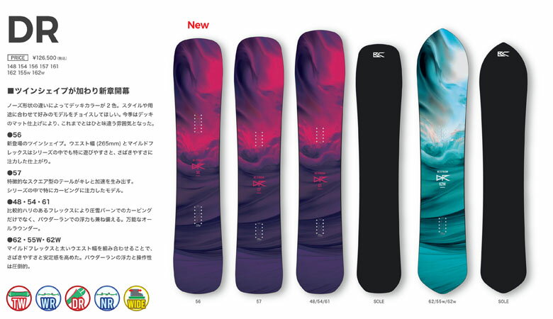 ■BC-STREAM(ビーシーストリーム) 1993年、創設者の中山氏によりアルパインボードの開発に着手し、BC-STREAMが誕生。1996年には自社工場を設立し、金型から一貫したスノーボードの生産設備を整え、翌年から自社製造のブランドBC-STREAMとしての販売を開始。 様々なゲレンデで、どのメーカーよりも試乗会をかさね、口コミをベースに徐々にBC-STREAMという名が浸透。そして20002年にフラッグシップモデルのSが誕生。そのSの人気を決定付けたのが、BC-STREAMライダーの全日本テクニカル選手権での優勝です。それまではOGASAKA、MOSSとテクニカルの二台ブランドだったのですが、新たにBC-STREAMという新興勢力が現れるカタチとなったのです。自社工場を保有するBC-STREAMは開発とテストを繰り返し早い段階で製品化できるというメリットを持っています。当時、まだどのメーカーも使っていなかった心材「桐」を使用し、軽さと小気味良い反発を得てライダー・ユーザーの高評価を得たのも研究熱心なBC-STREAMだから可能となった出来事かもしれません。 ■BC-STREAM DR(ビーシーストリーム ディーアール) 商品説明 ツインシェイプが加わり新章開幕 ノーズ形状の違いによってデッキカラーが2 色。スタイルや用途に合わせて好みのモデルをチョイスしてほしい。今季はデッキのマット仕上げにより、これまでとはひと味違う雰囲気となった。 ・156 新登場のツインシェイプ。ウエスト幅(265mm) とマイルドフレックスはシリーズの中でも特に遊びやすさと、さばきやすさに注力した仕上がり。 ・157 特徴的なスクエア型のテールがキレと加速を生み出す。DR シリーズの中で特にカービングに注力したモデル。 ・148 - 154 - 161z 比較的ハリのあるフレックスにより圧雪バーンでのカービングだけでなく、パウダーランでの浮力も兼ね備える。万能なオールラウンダー。 ・162 - 155W - 162W マイルドフレックスと太いウエスト幅を組み合わせることで、さばきやすさと安定感を高めた。パウダーランの浮力と操作性は圧倒的。 オールラウンドに使用できる新しいコンセプトの高反発ディレクショナルモデルです。他のカービングモデルと一線を画すフリースタイル性能が特徴なモデルです。 ジュニア、ユニセックス対応の141,145,148,151とメンズ対応の150,153,156,159の豊富な8サイズのラインナップ。■BC-STREAM(ビーシーストリーム) 1993年、創設者の中山氏によりアルパインボードの開発に着手し、BC-STREAMが誕生。1996年には自社工場を設立し、金型から一貫したスノーボードの生産設備を整え、翌年から自社製造のブランドBC-STREAMとしての販売を開始。 様々なゲレンデで、どのメーカーよりも試乗会をかさね、口コミをベースに徐々にBC-STREAMという名が浸透。そして20002年にフラッグシップモデルのSが誕生。そのSの人気を決定付けたのが、BC-STREAMライダーの全日本テクニカル選手権での優勝です。それまではOGASAKA、MOSSとテクニカルの二台ブランドだったのですが、新たにBC-STREAMという新興勢力が現れるカタチとなったのです。自社工場を保有するBC-STREAMは開発とテストを繰り返し早い段階で製品化できるというメリットを持っています。当時、まだどのメーカーも使っていなかった心材「桐」を使用し、軽さと小気味良い反発を得てライダー・ユーザーの高評価を得たのも研究熱心なBC-STREAMだから可能となった出来事かもしれません。 25-26 BC-STREAM DR(ビーシーストリーム ディーアール) ツインチップが加わり新章開幕 ■BC-STREAM DR(ビーシーストリーム ディーアール) 商品説明 ツインシェイプが加わり新章開幕 ノーズ形状の違いによってデッキカラーが2 色。スタイルや用途に合わせて好みのモデルをチョイスしてほしい。今季はデッキのマット仕上げにより、これまでとはひと味違う雰囲気となった。 ・156 新登場のツインシェイプ。ウエスト幅(265mm) とマイルドフレックスはシリーズの中でも特に遊びやすさと、さばきやすさに注力した仕上がり。 ・157 特徴的なスクエア型のテールがキレと加速を生み出す。DR シリーズの中で特にカービングに注力したモデル。 ・148 - 154 - 161z 比較的ハリのあるフレックスにより圧雪バーンでのカービングだけでなく、パウダーランでの浮力も兼ね備える。万能なオールラウンダー。 ・162 - 155W - 162W マイルドフレックスと太いウエスト幅を組み合わせることで、さばきやすさと安定感を高めた。パウダーランの浮力と操作性は圧倒的。 オールラウンドに使用できる新しいコンセプトの高反発ディレクショナルモデルです。他のカービングモデルと一線を画すフリースタイル性能が特徴なモデルです。 ジュニア、ユニセックス対応の141,145,148,151とメンズ対応の150,153,156,159の豊富な8サイズのラインナップ。