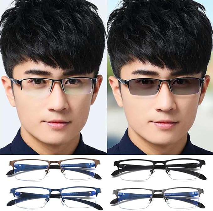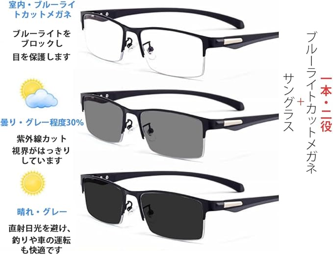 FEISEDY ブルーライトカット メガネ PCメガネ 変色 調光 超軽量 伊達メガネ パソコン用 度なし 透明レンズ スクエア ハーフリム メンズ レディーズ B1256