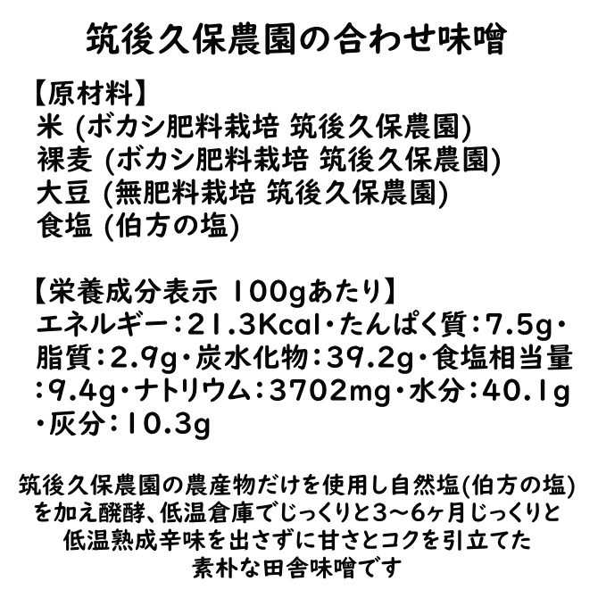 素材に、製法にこだわり抜いた九州の合わせみそ。 甘さとコクを少し抑えて素材のもつ美味しさを最大限に引き立てました。素材は全て筑後久保農園産の無農薬米・麦、そして無肥料栽培大豆。 こだわりすぎてこんな価格になってごめんなさい。 当店の中では最も販売数の少ない味噌ですが、リピート率9割以上の隠れた人気味噌です。 九州の味噌は独特な味わいですので初めての方はまず1袋ご利用されることをお奨めします。 ※ご注文が重なるとすぐに品切れしてしまいます。その際はご容赦下さい。 ※1回のご注文で2袋までとさせて頂きます。 ※筑後久保農園より産地直送致します。他の味噌などと同梱できません。ご了承下さい。