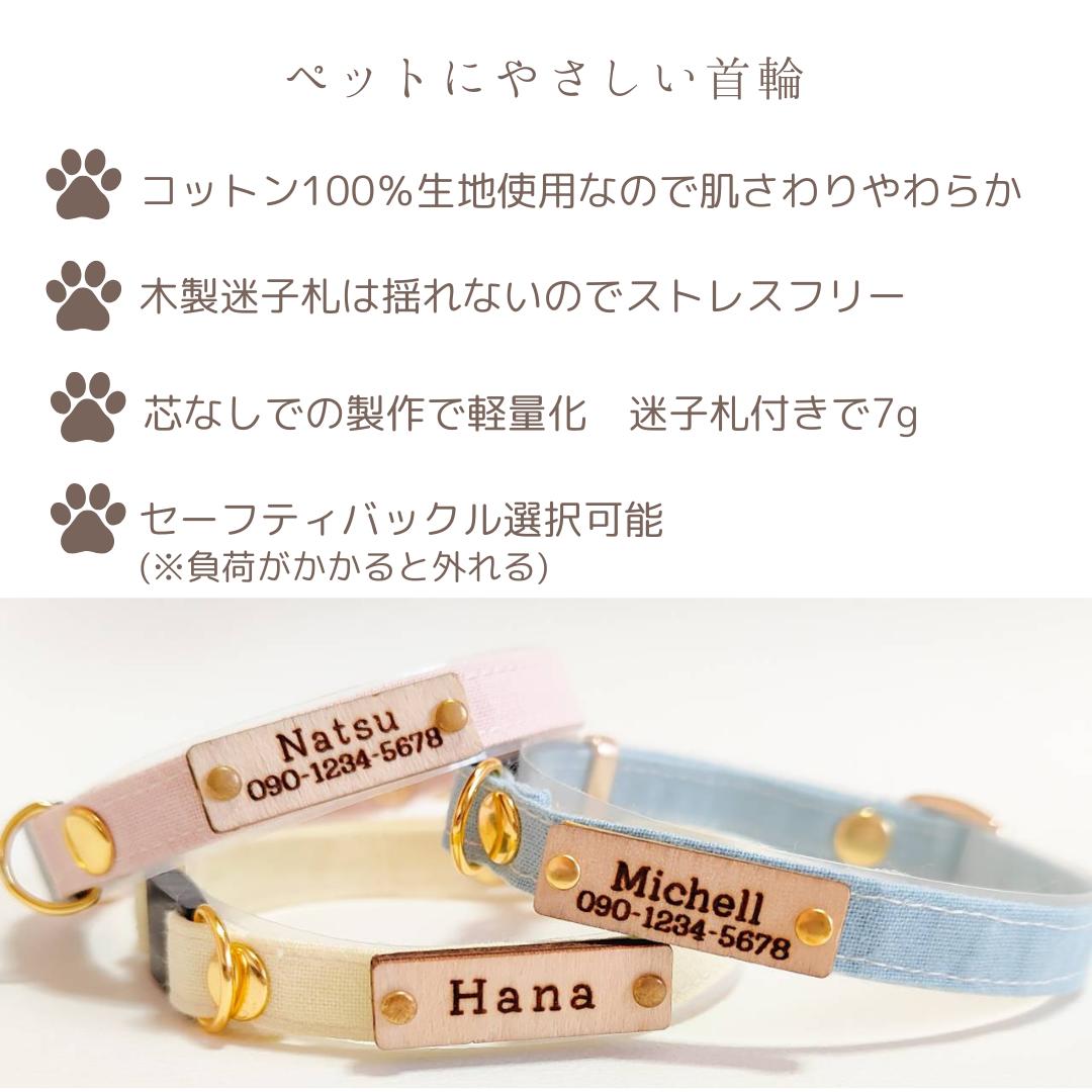 商品情報商品猫用首輪・犬用首輪・ミーアキャット(ミーアキャットへ着用の場合は無料でサイズ小さくしますので備考欄にてサイズをお伺いします)素材生地:コットン100%糸:ポリエステルバックル:プラスチック迷子札:木製製造日本製サイズ19~28cmの間で調整可能幅1cm7gバックル猫用セーフティバックル犬用外れないバックル商品説明安心安全の日本製あたたかみのある木製迷子札付き超軽量でペットにストレスフリーな首輪迷子札はぶらぶらしないのでペットも気になりません♪万が一の迷子に備えて迷子付の首輪迷子札はお名前のみも可能です。飼い主様の電話番号やペットの名前を彫刻できます。注意事項・オーナー様の監視の下で着用お願いします。・万一の事故には一切の責任を負えません。【商品の色味について】・商品写真はできる限り実物の色に近づけるよう加工しておりますが、お客様が使用するパソコンのモニター設定や部屋の照明により多少、色の変化が感じられる場合がございます。【彫刻について】・とても小さい迷子札に彫刻しています。中心からの誤差、文字の若干の歪み、濃淡、少々のズレはご容赦願います。・スペース上、刻印のバランスはお任せ頂いております。【生地について】・・同じ商品でも“生産時期”や“カラー“により形やサイズに多少の“誤差“が生じる場合もございます。詳しくは商品画像や実寸サイズにてご確認くださいませ。・プリント生地の商品については、生地の裁断・縫製方法により写真と同様の柄が出ない場合がございます。【サイズについて】・表記しているサイズは平置きで採寸ですので若干の誤差が生じる場合がございます【商品について】・濃色品は多少色落ちすることがあります、ご注意ください。気になる点はご購入前にお問い合わせください。Felesto 迷子札付き 猫用首輪 シンプル ゴールド オーダーメイド 猫 日本製 国産 首輪 猫首輪 迷子札 バックル おしゃれ 名入れ 超軽量 ネームタグ 迷子札付猫首輪 犬 小型犬 軽い ペットグッズ 刻印ネームタグ 安心安全 コットン 安全 可愛い ストレスフリー 1個販売 猫 首輪 セーフティ 安全 日本製 バックル おしゃれ かわいい 猫用首輪 名入れ 名前入 犬の首輪 ペットグッズ ギフト セーフティバックル 名前 軽い 猫の脱走防止 ストレスフリー 5